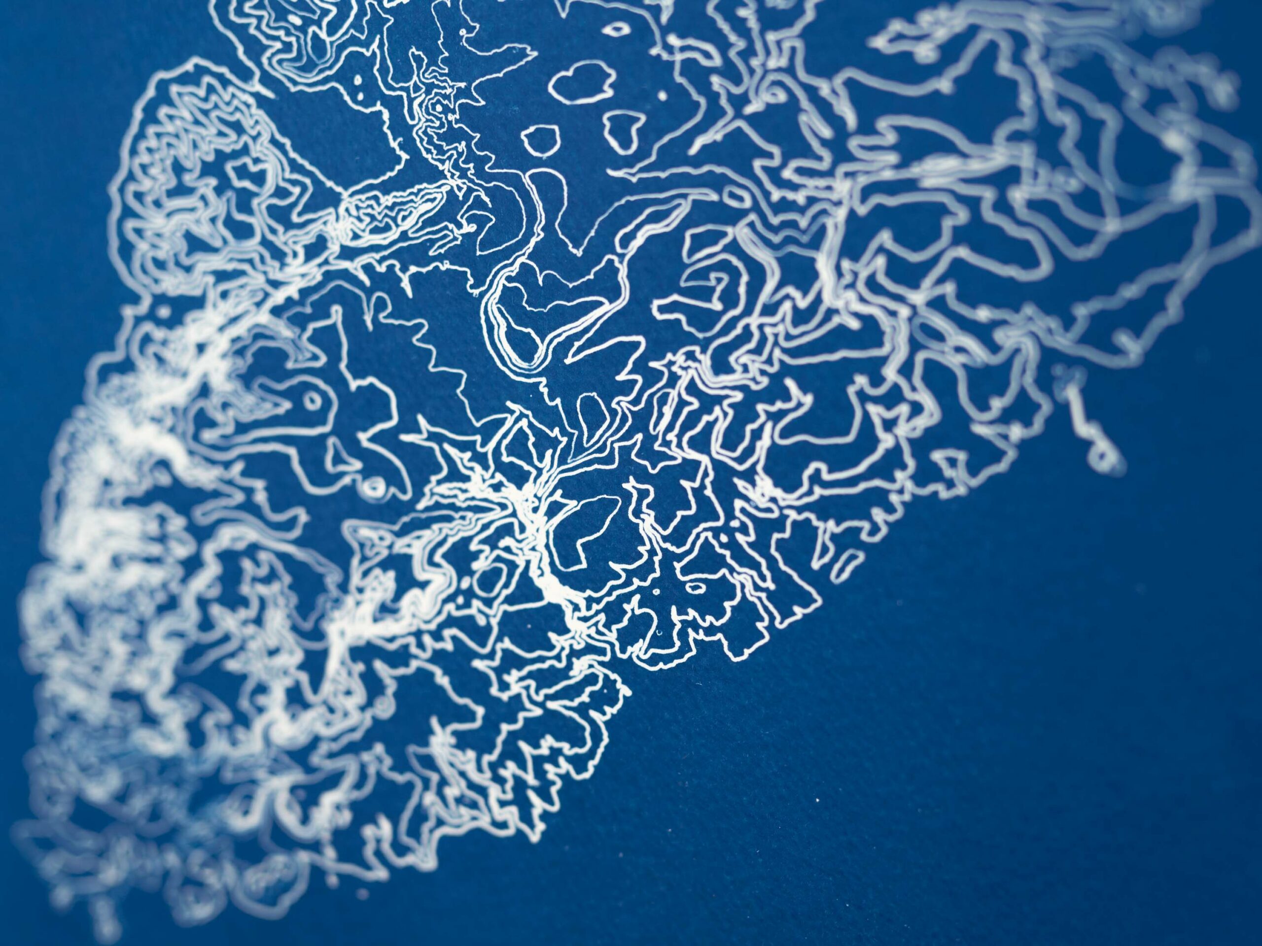 Le cyanotype, c’est une technique de photographie ancienne datant des années 1850, sensible aux UVs, qui permet d’obtenir des tirages en bleu de Prusse & blanc.