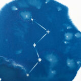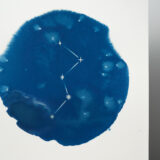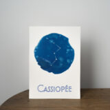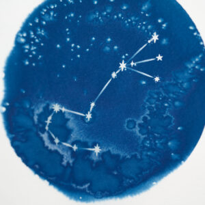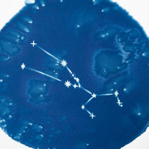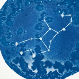 Tirage cyanotype d’une illustration de constellation, représentant Cassiopée, sur papier aquarelle 300g.