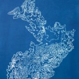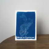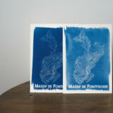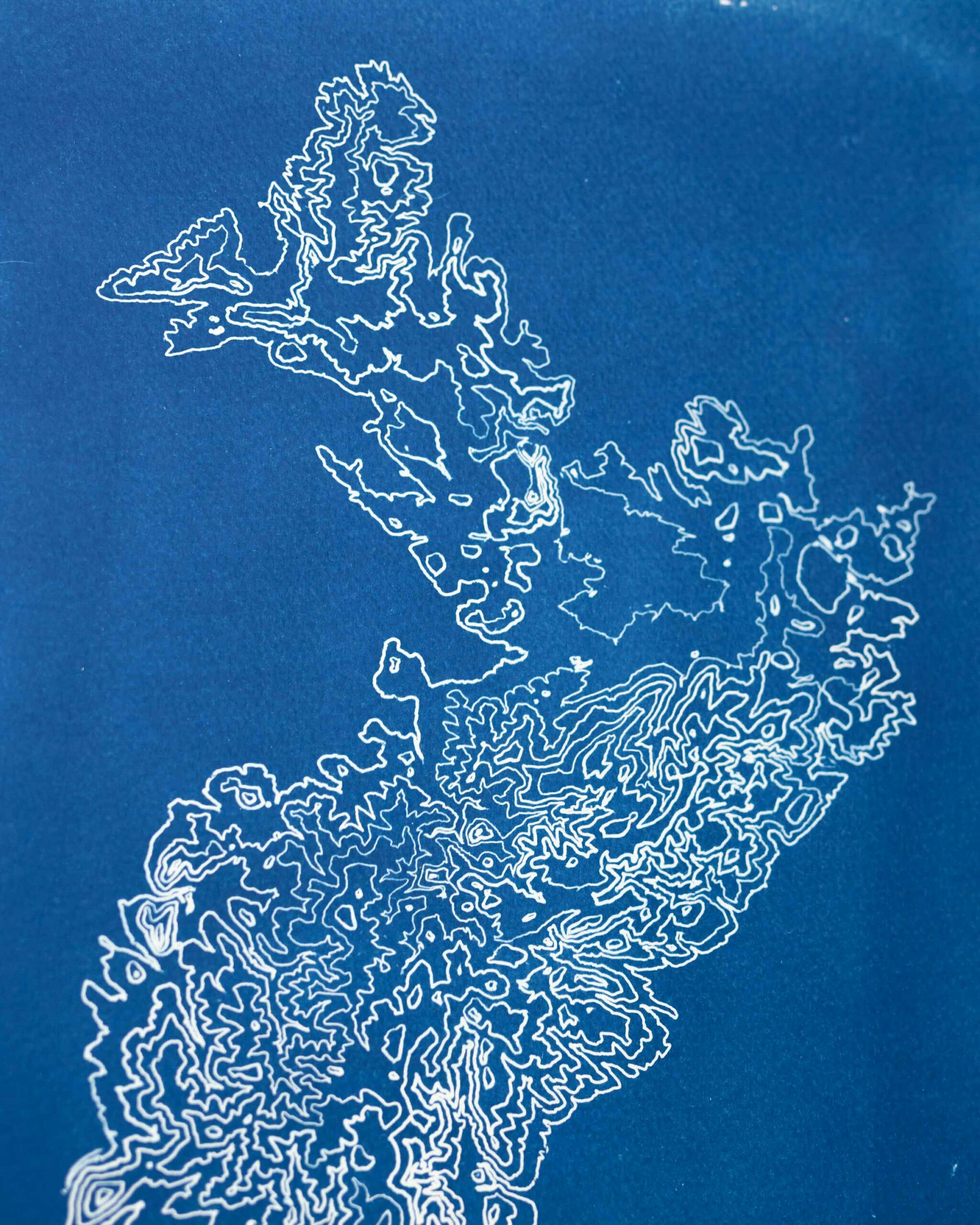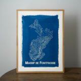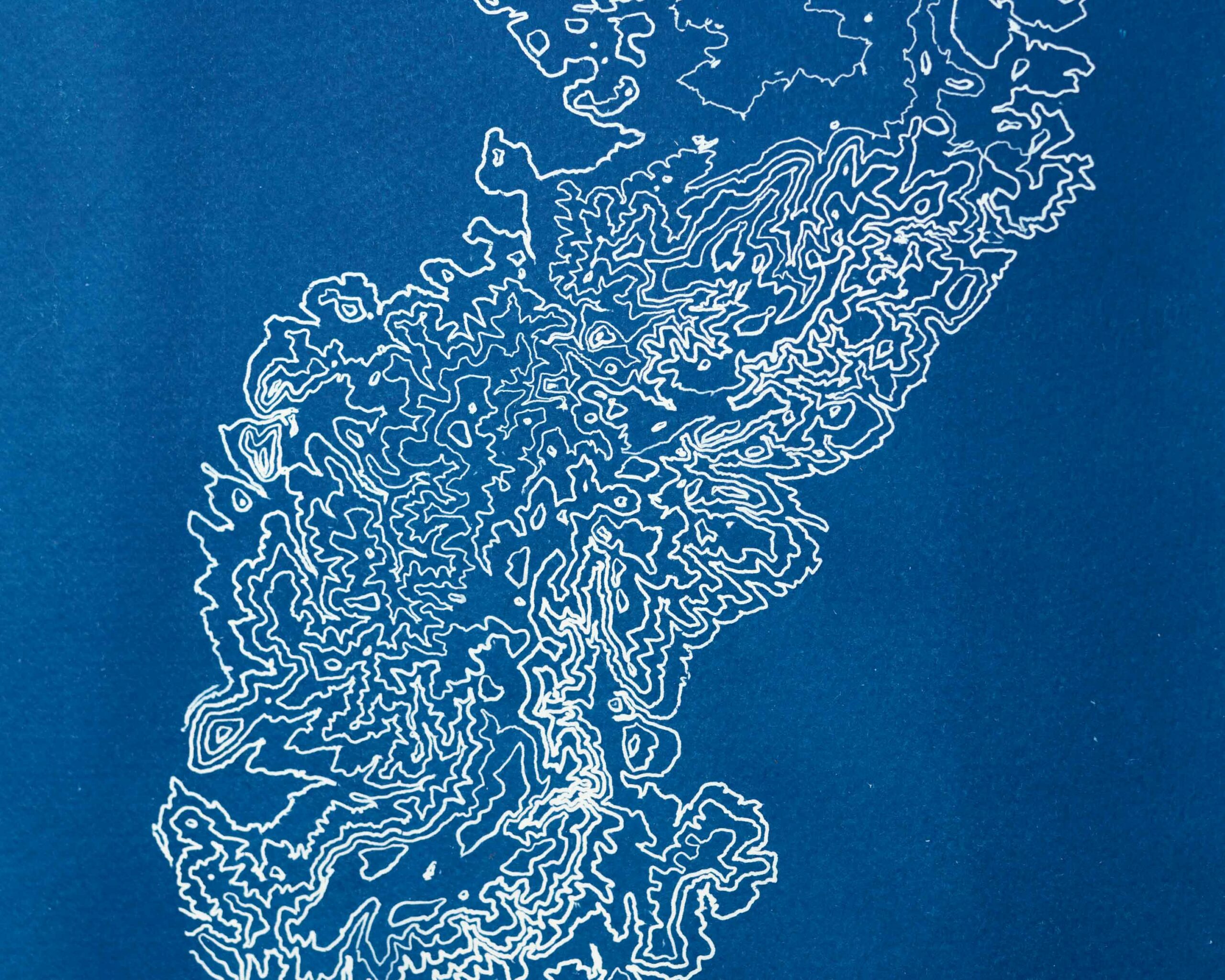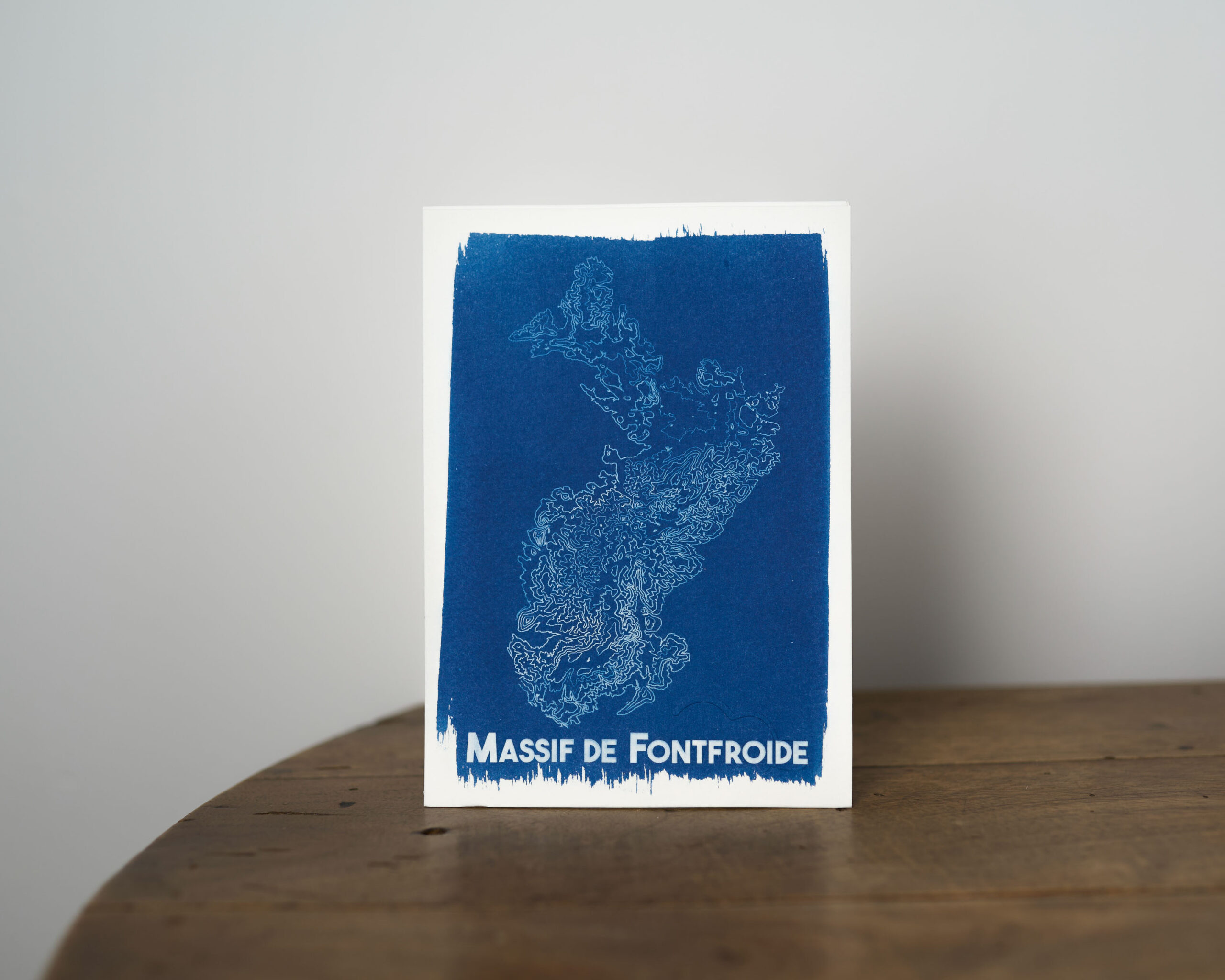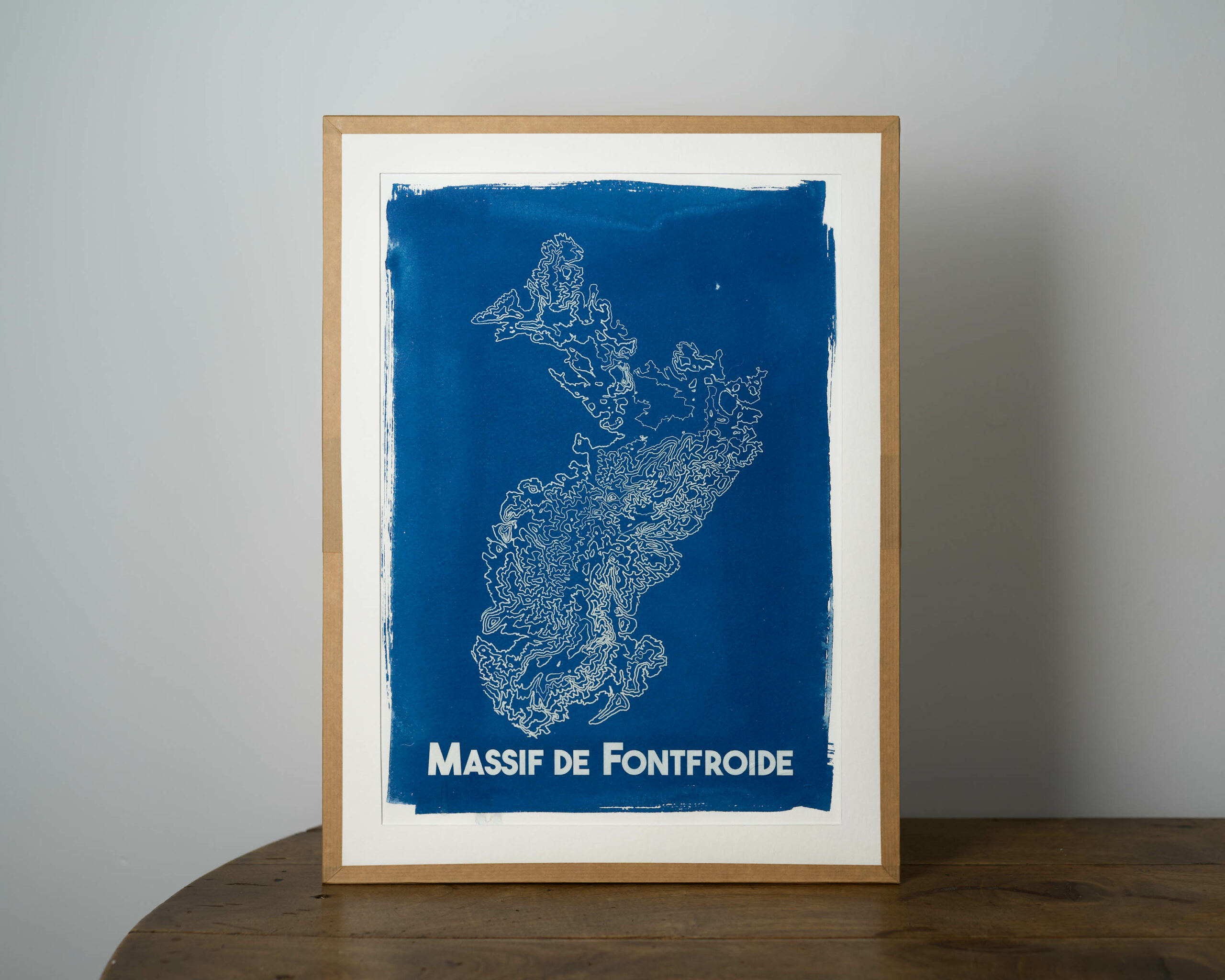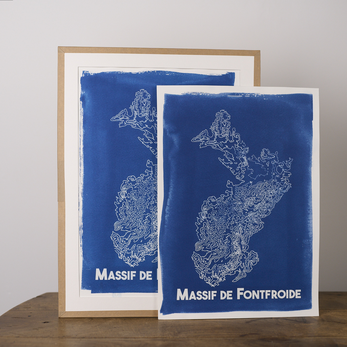 Tirage cyanotype d’une illustration réalisée à partir des relevés topographiques, sur papier aquarelle 300g. Il représente le massif de Fontfroide grâce à ses courbes de niveaux.