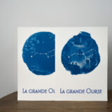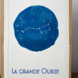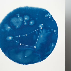 Tirage cyanotype d’une illustration de constellation, représentant la grande ourse, sur papier aquarelle 300g.