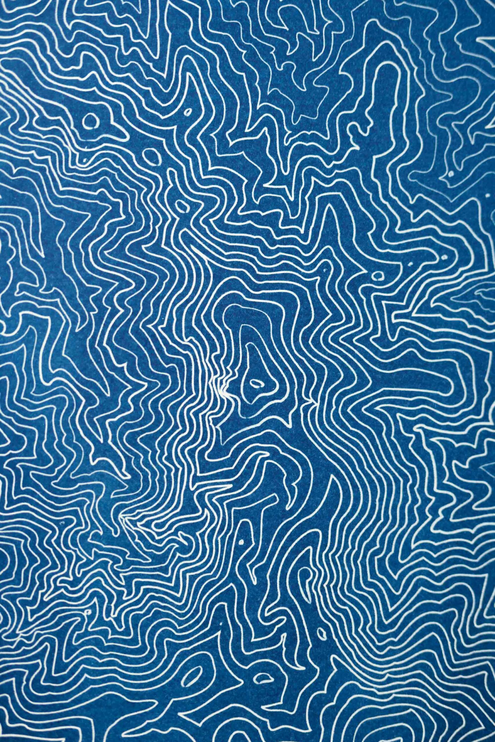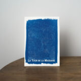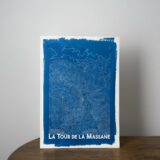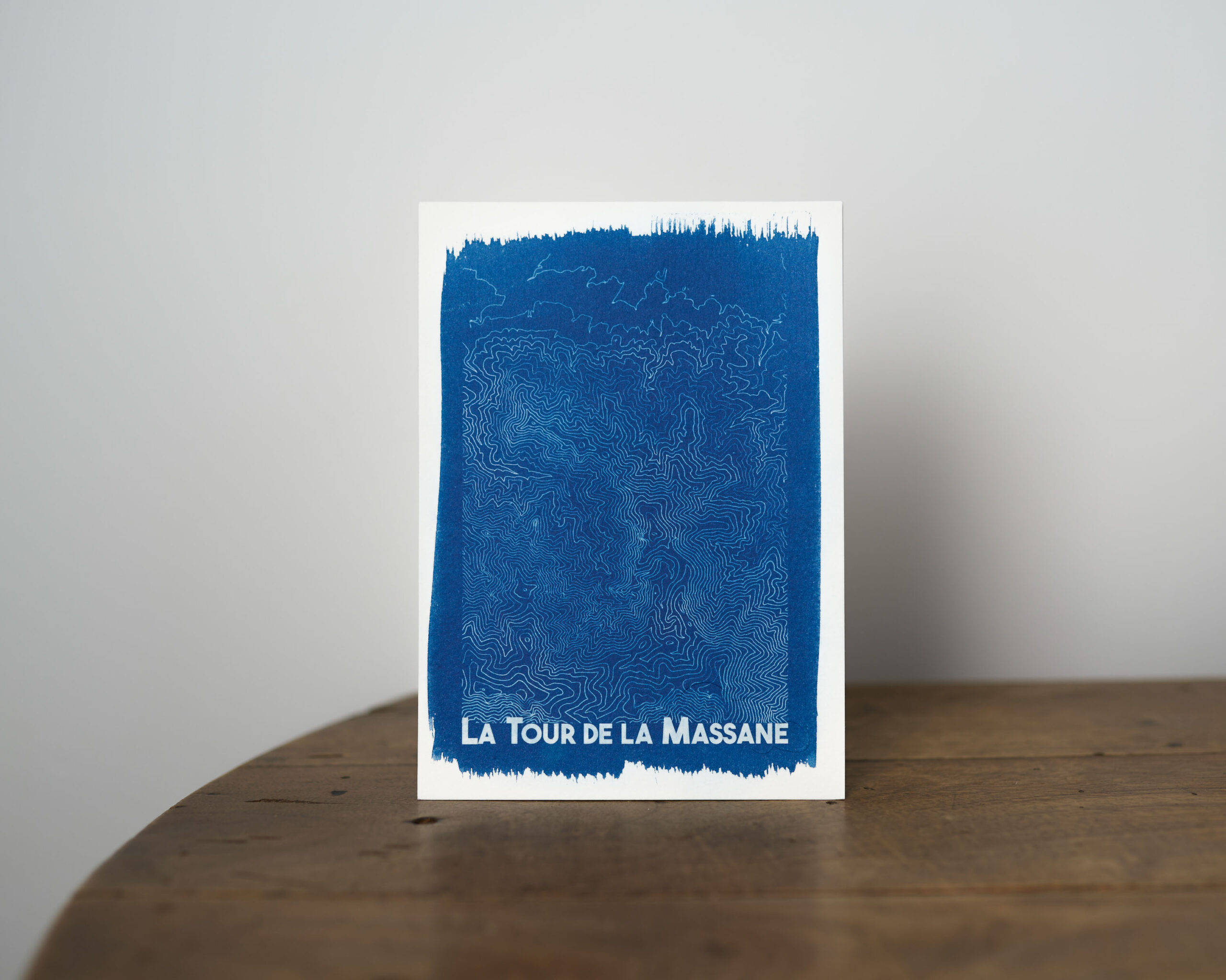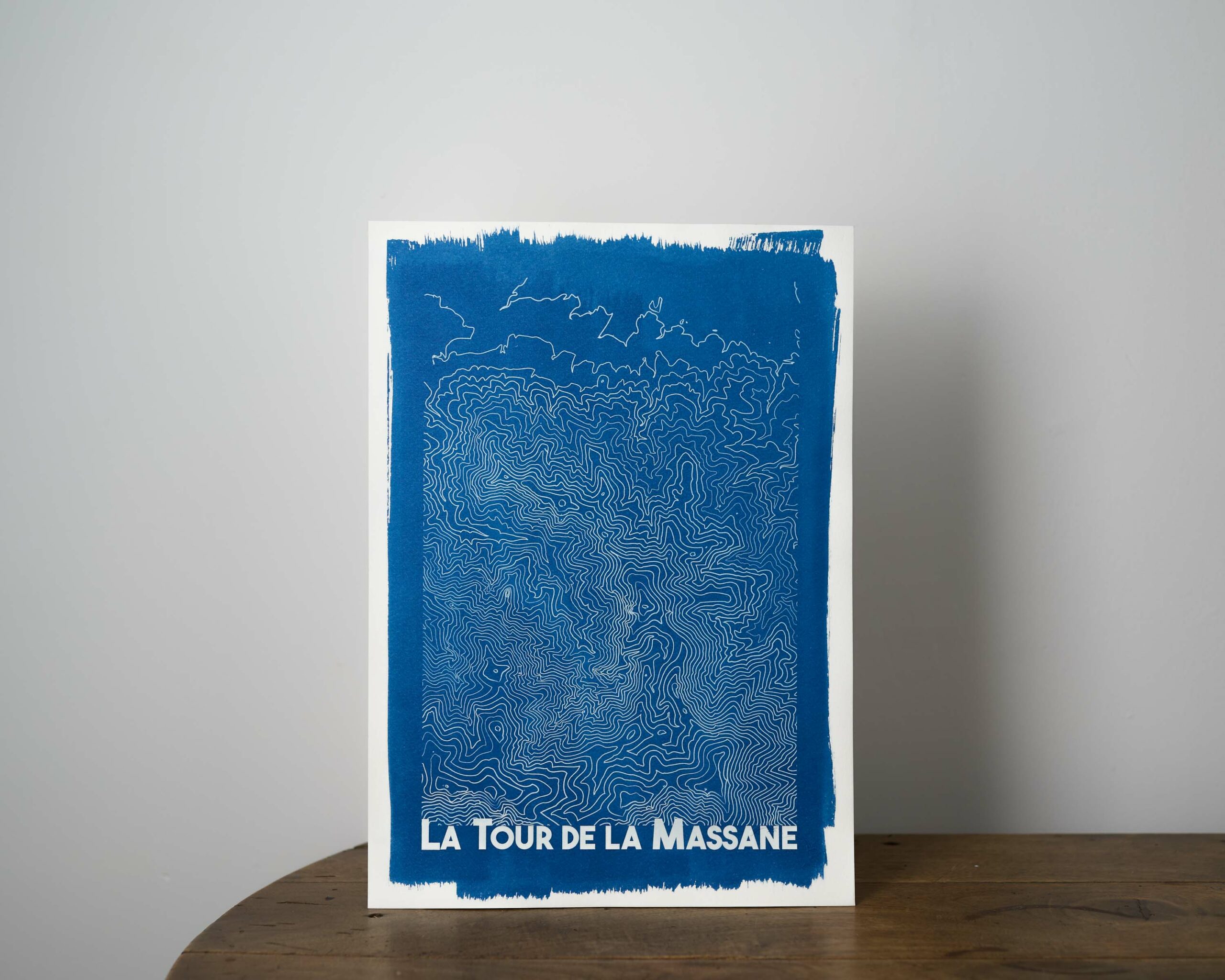 Tirage cyanotype d’une illustration réalisée à partir des relevés topographiques, sur papier aquarelle 300g. Il représente la Tour de la Massane, d’après ses courbes de niveaux.