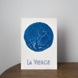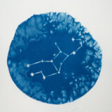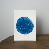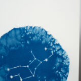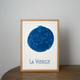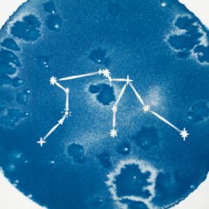 Tirage cyanotype d’une illustration de constellation, représentant la constellation de la vierge, sur papier aquarelle 300g.