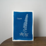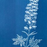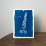 Tirage cyanotype d’une illustration de pied d’alouette (alias delphinium), sur papier aquarelle 300g.