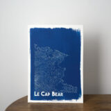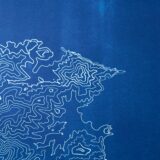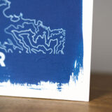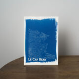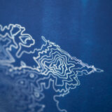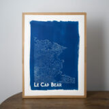 Tirage cyanotype d’une illustration réalisée à partir des relevés topographiques, sur papier aquarelle 300g. Il représente le Cap Béar, d’après ses courbes de niveaux.