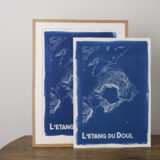 Tirage cyanotype d’une illustration réalisée à partir des relevés topographiques, sur papier aquarelle 300g.Il représente l’étang du Doul grâce à ses courbes de niveaux.