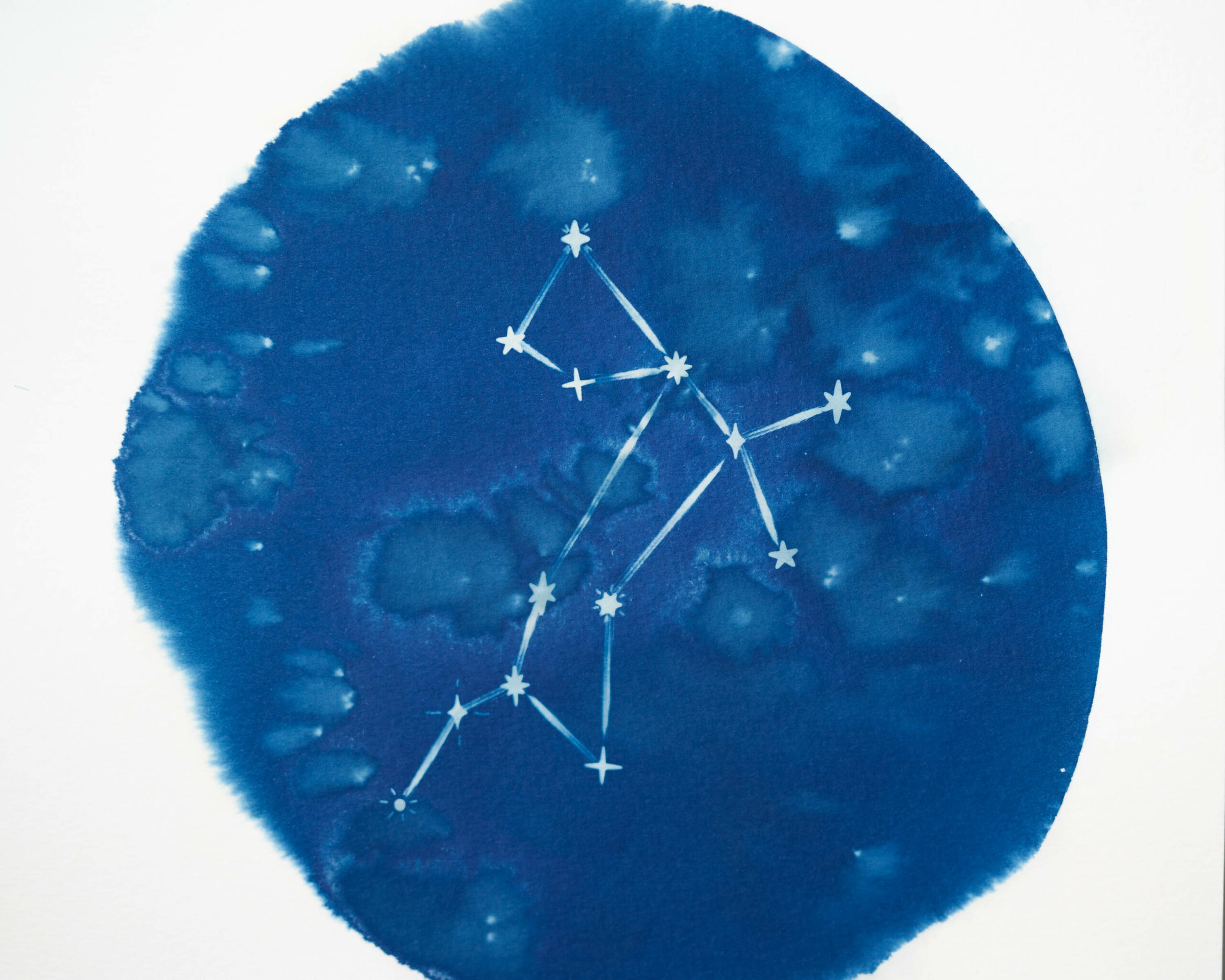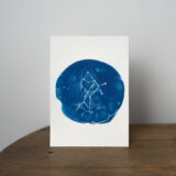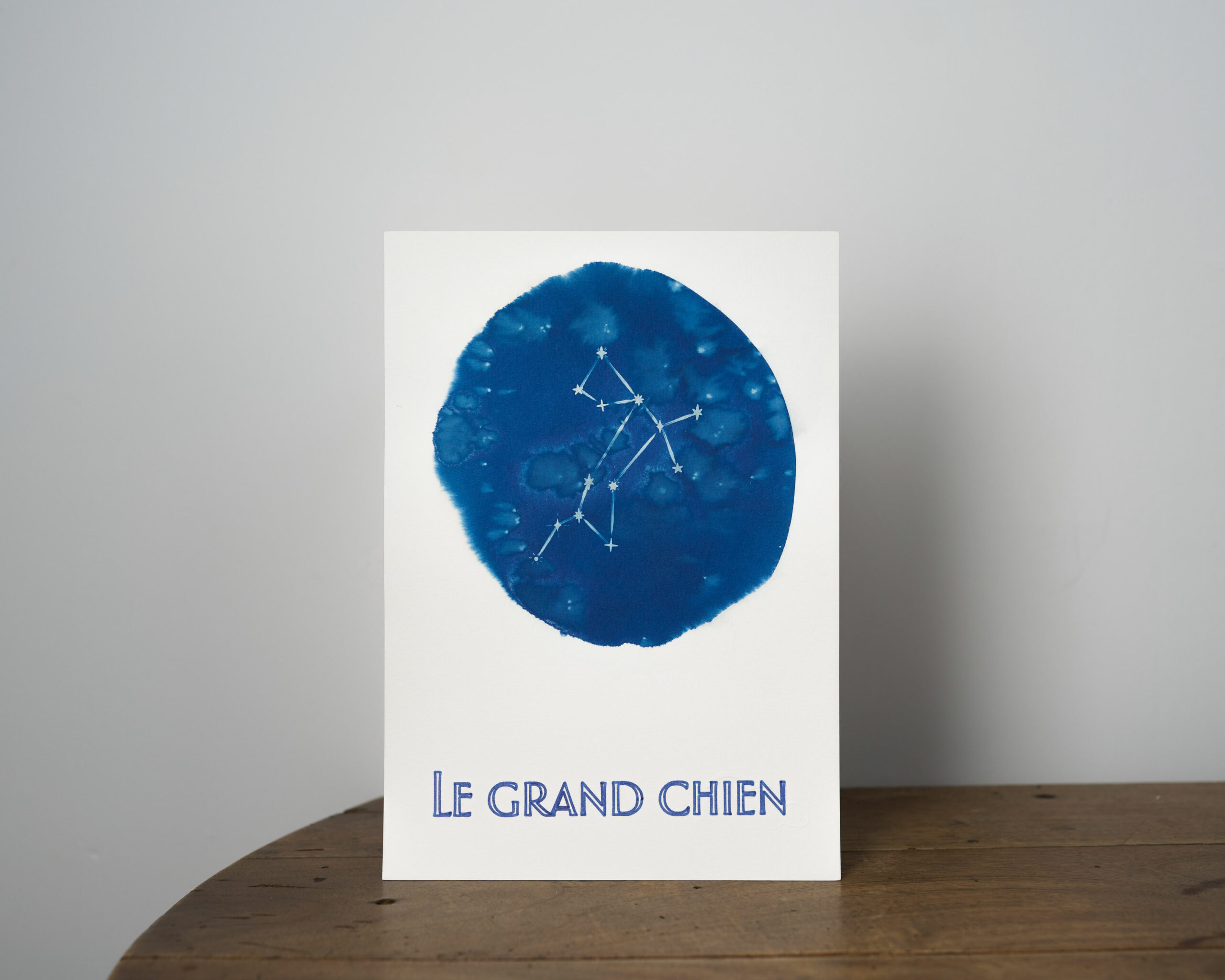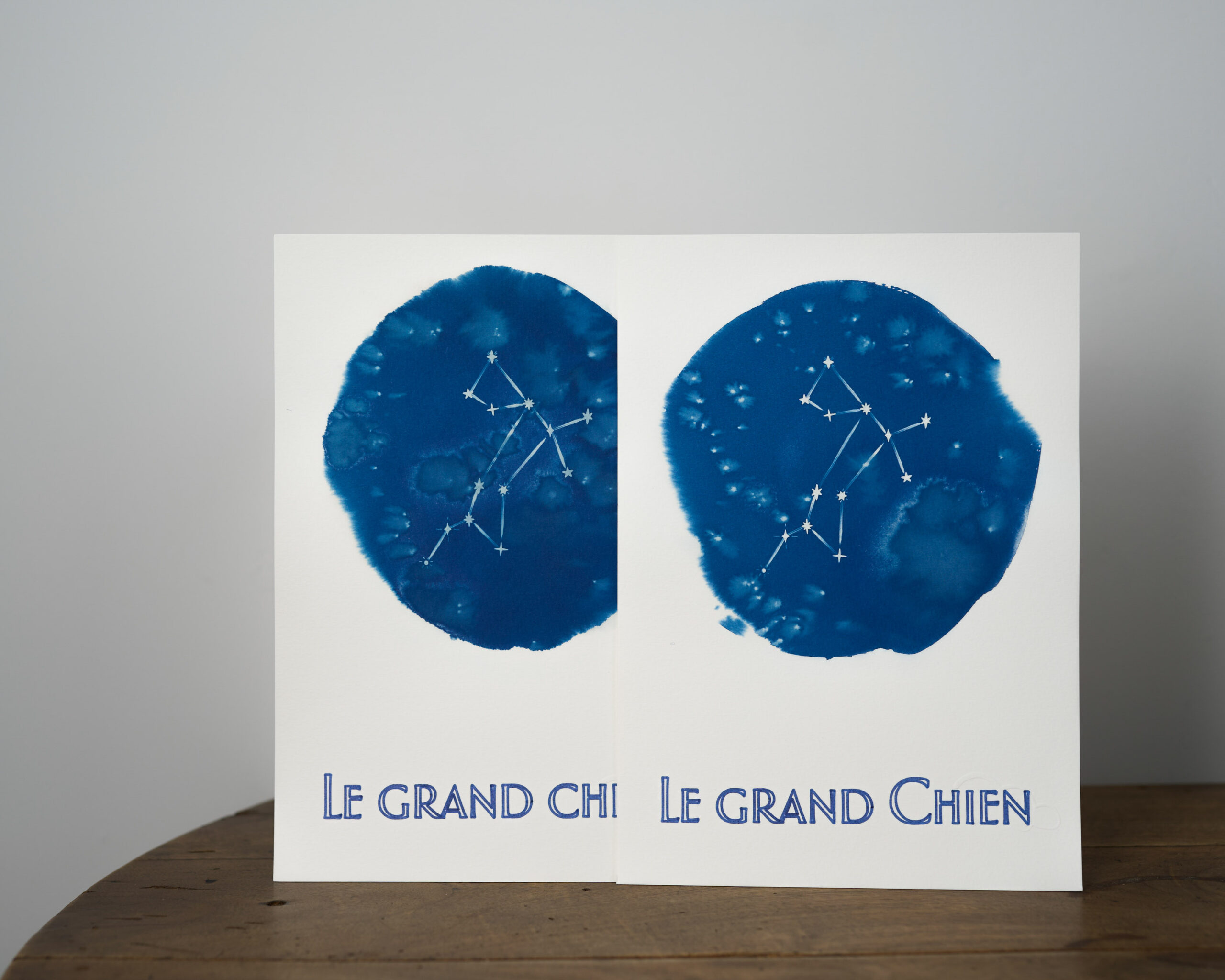 Tirage cyanotype d’une illustration de constellation, représentant le grand chien (Canis major), sur papier aquarelle 300g.