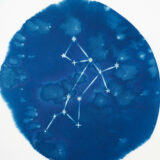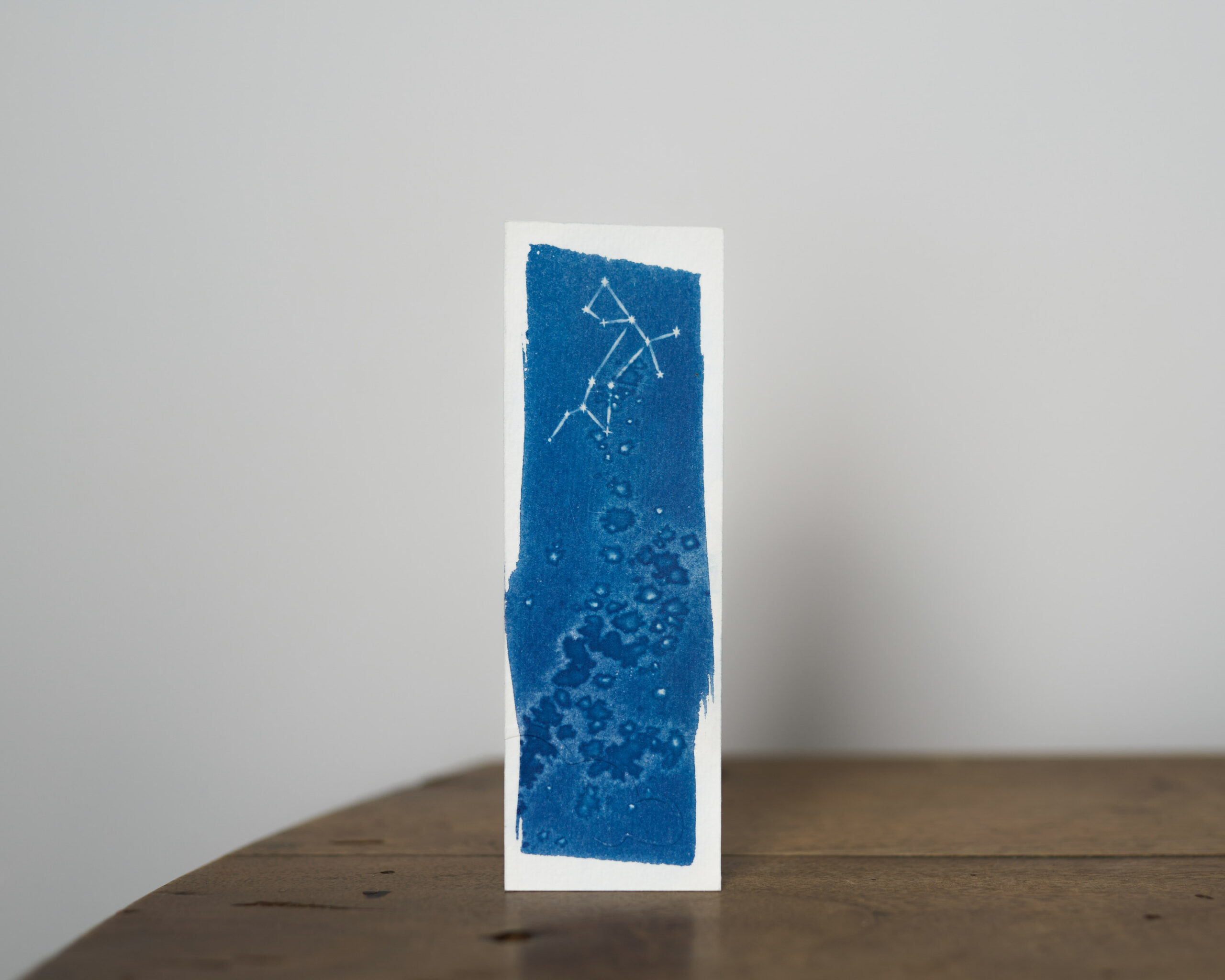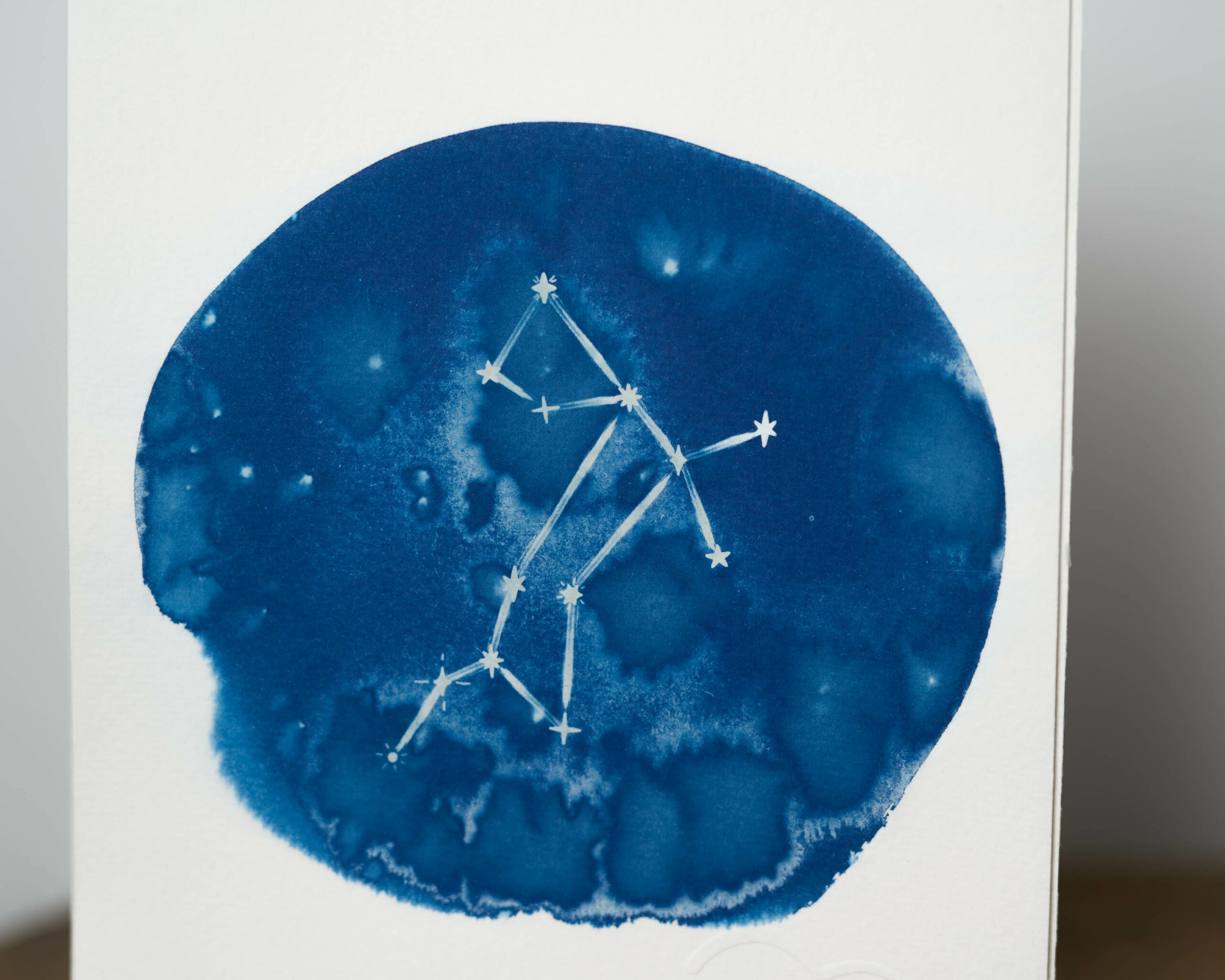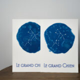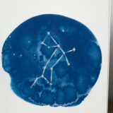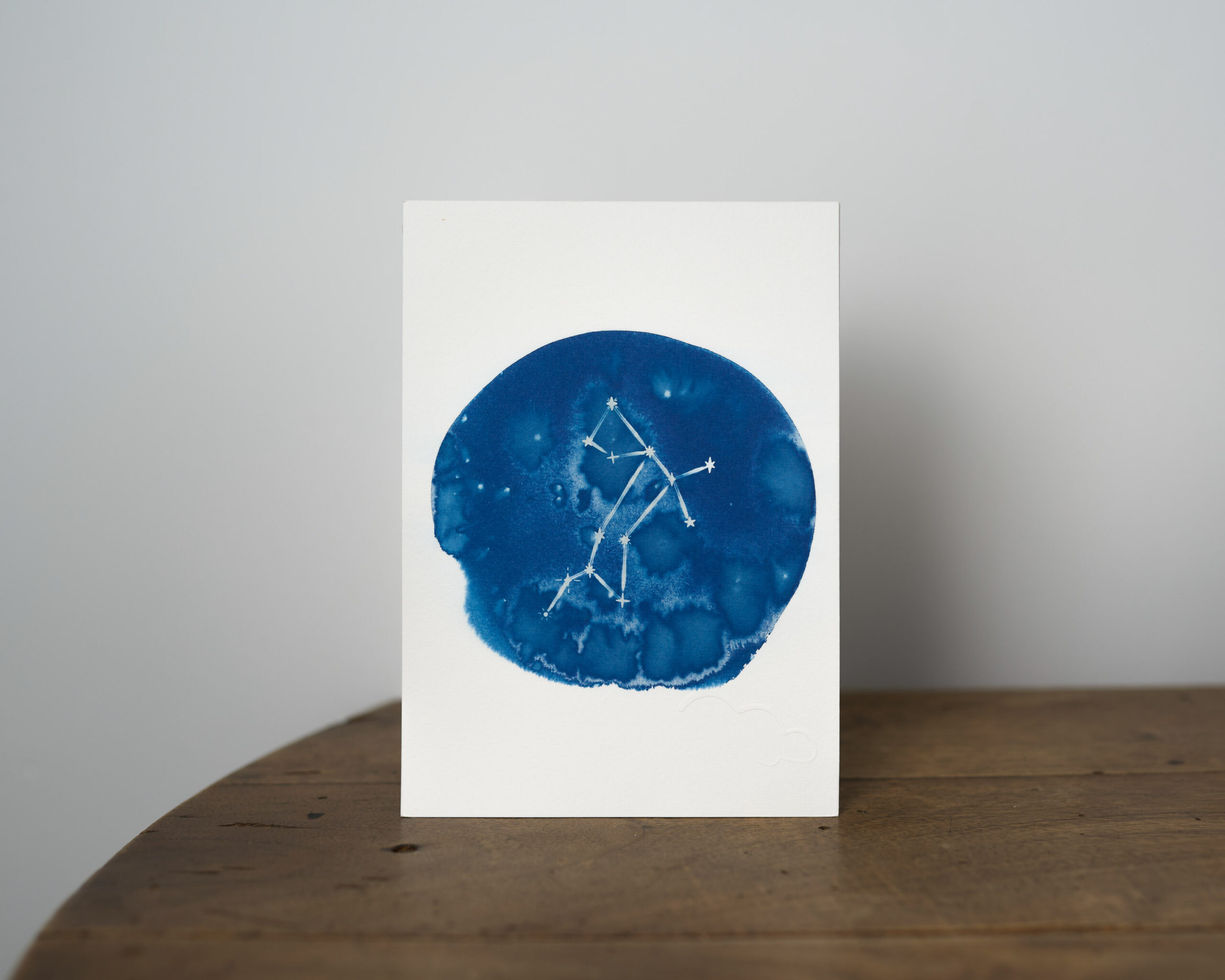 Tirage cyanotype d’une illustration de constellation, représentant le grand chien (Canis major), sur papier aquarelle 300g.