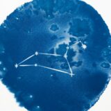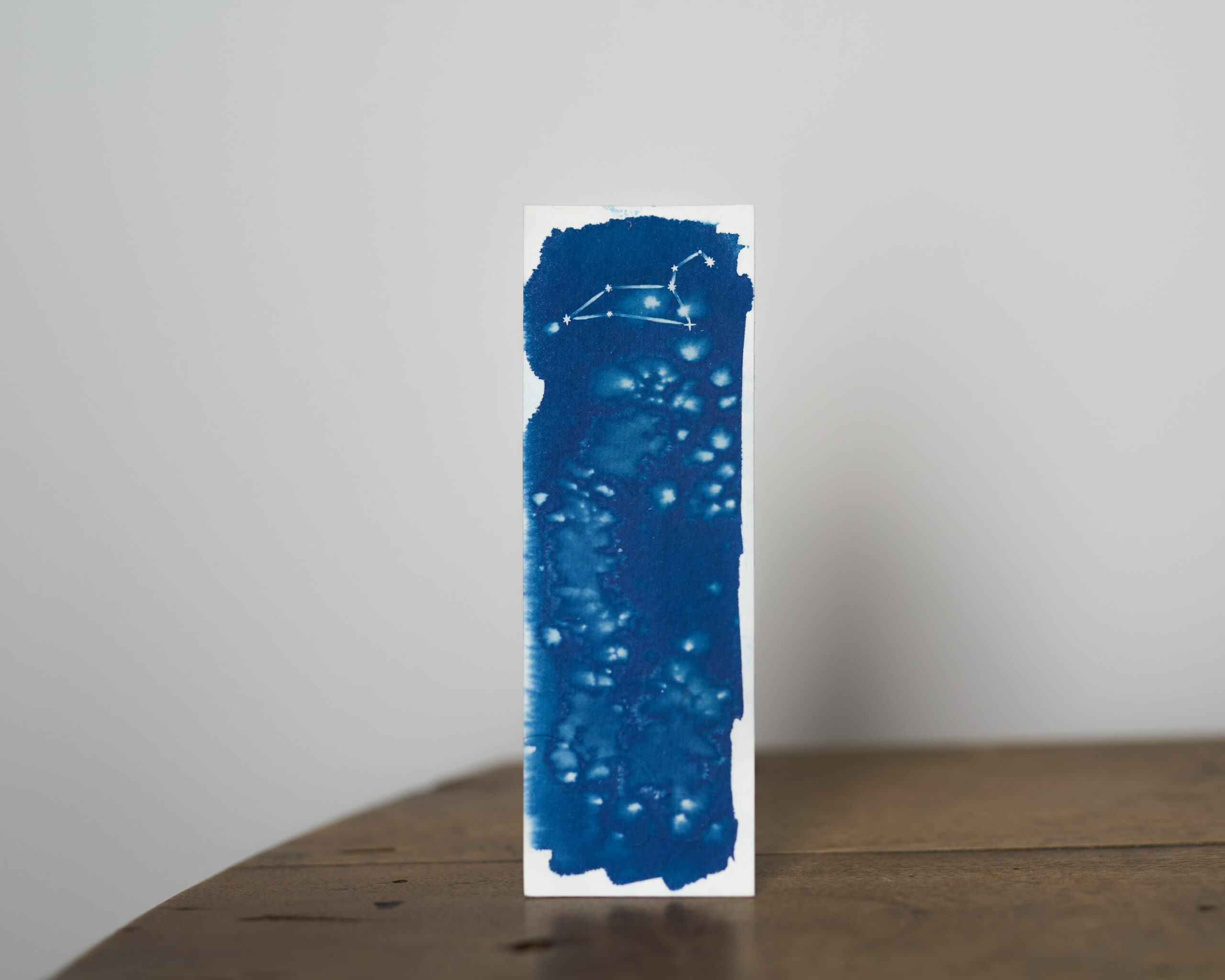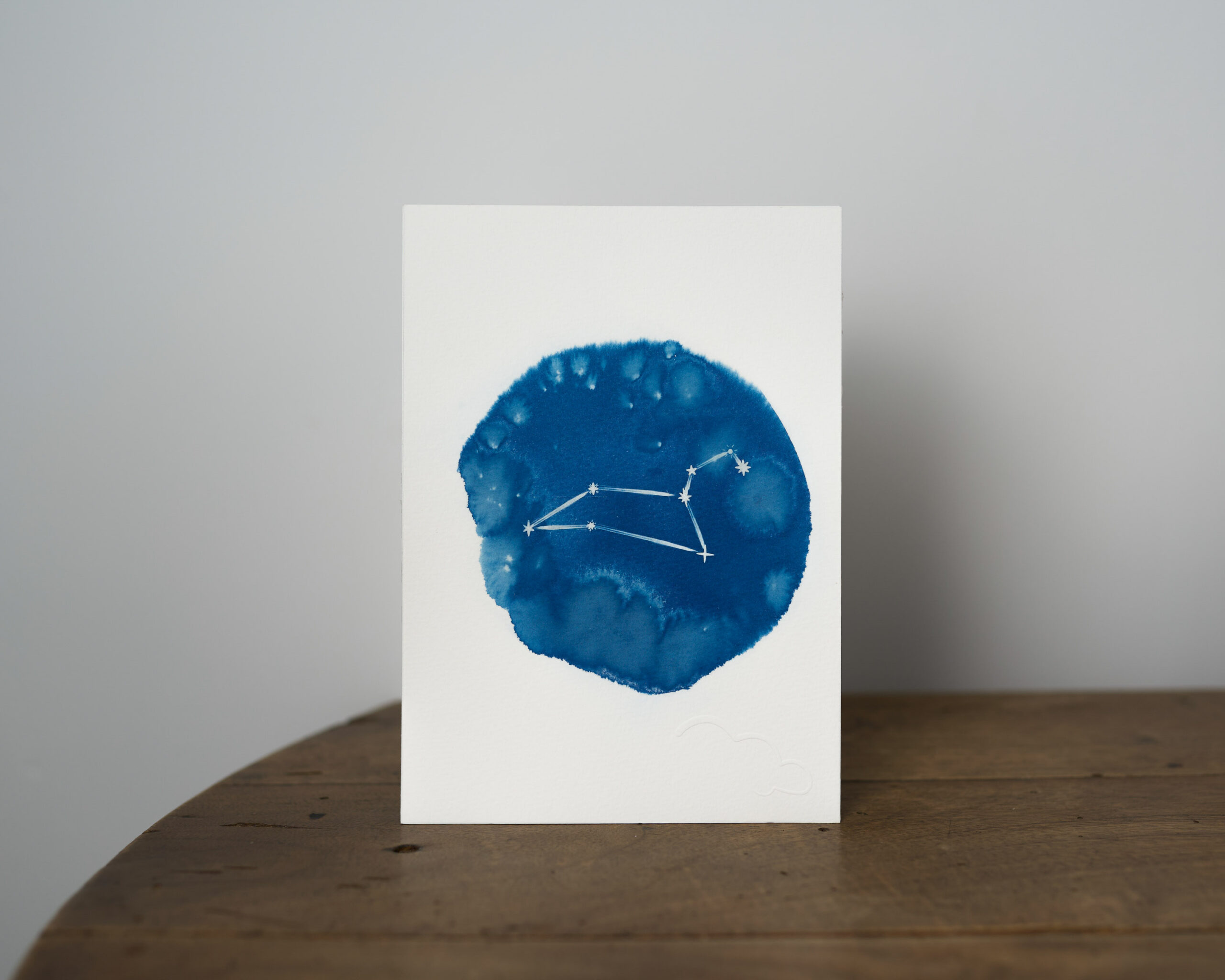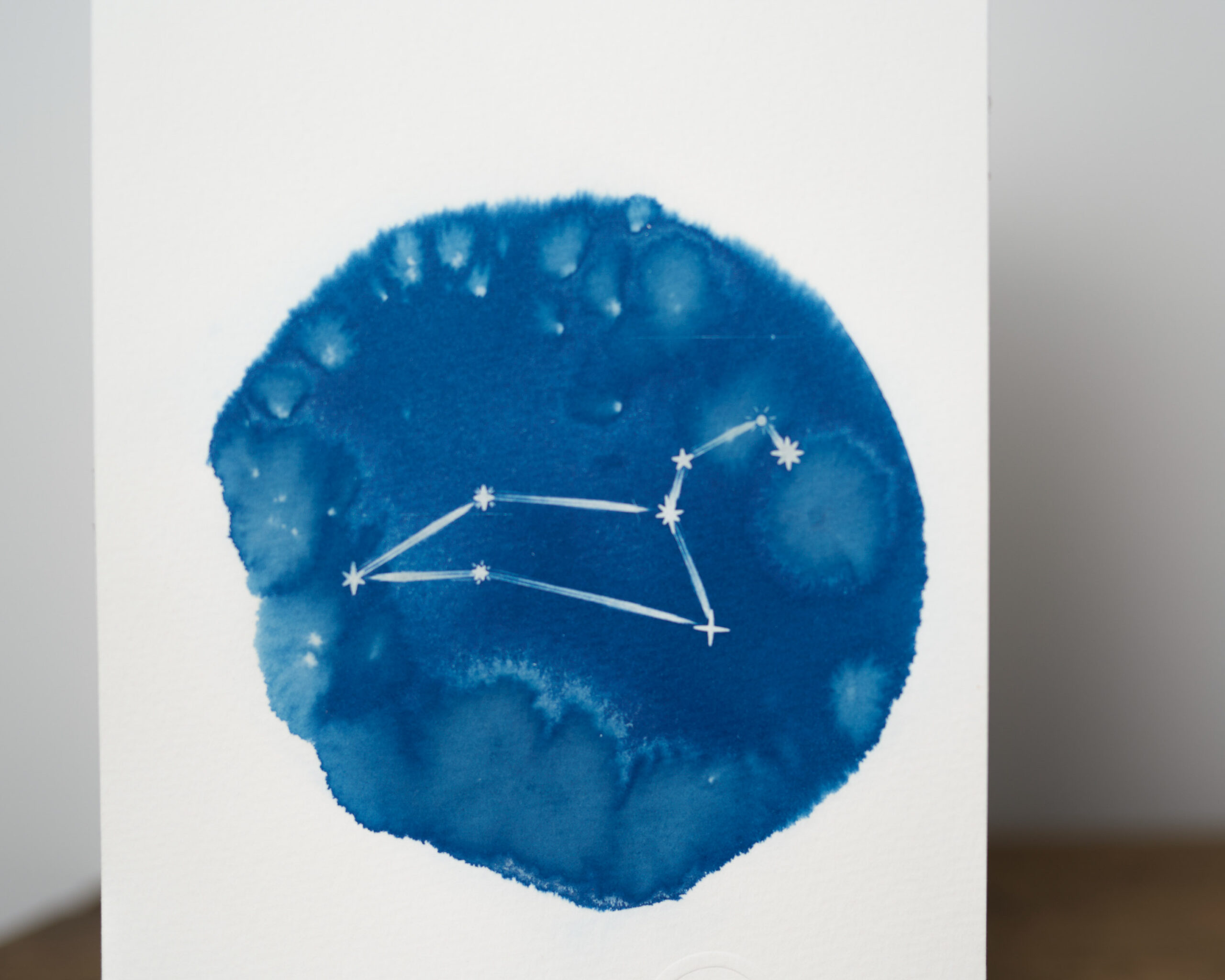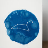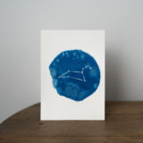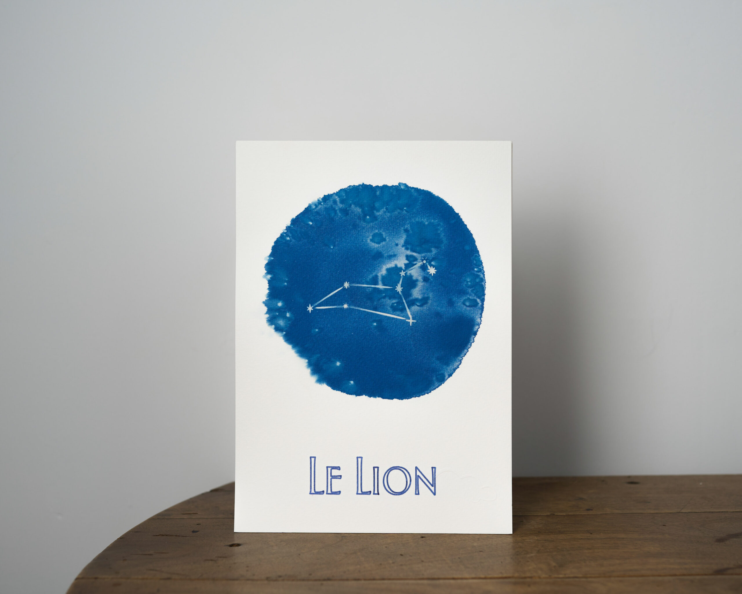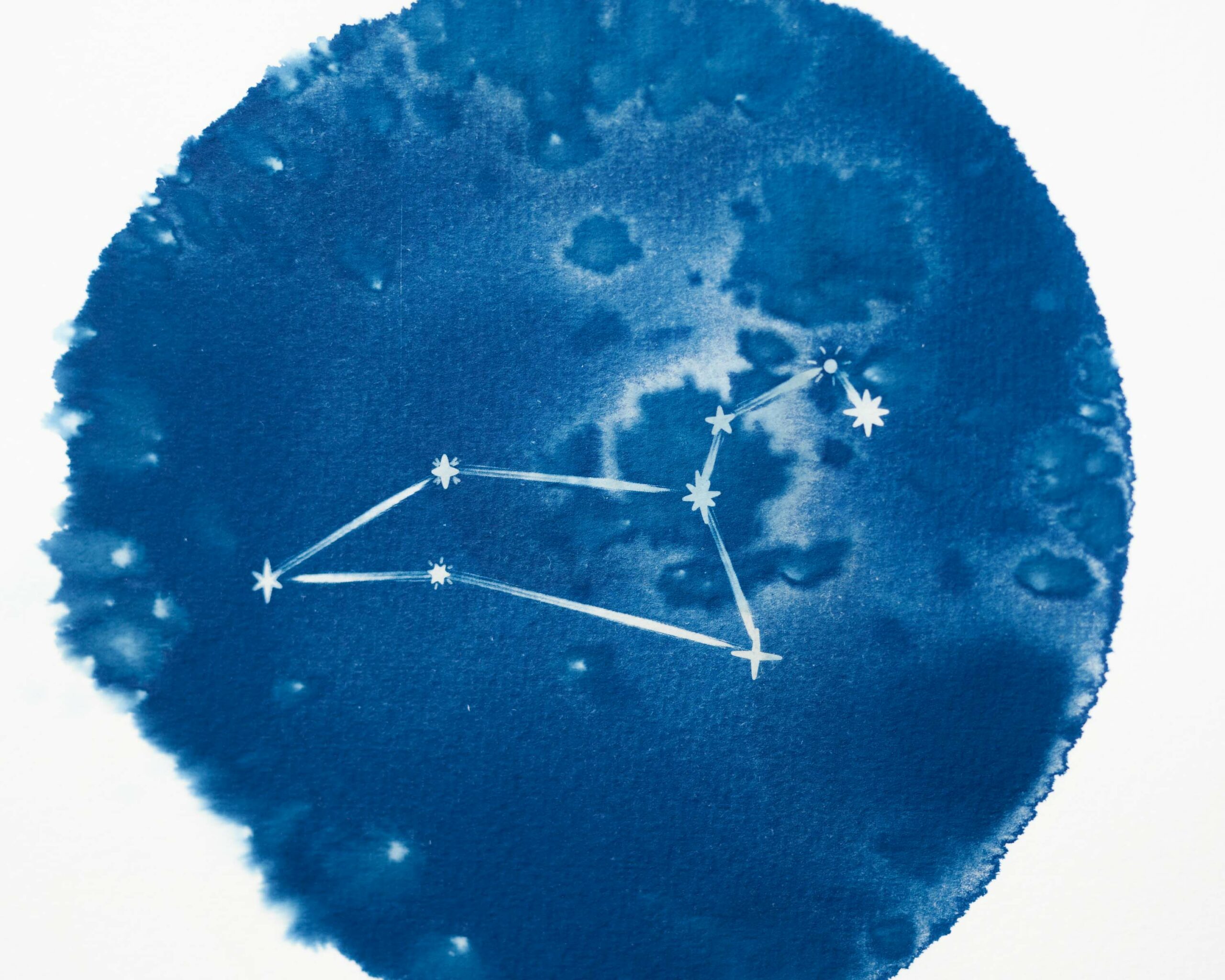 Tirage cyanotype d’une illustration de constellation, représentant la constellation du lion, sur papier aquarelle 300g.