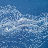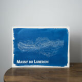 Tirage cyanotype d’une illustration réalisée à partir des relevés topographiques, sur papier aquarelle 300g. Il représente le massif du Luberon, d’après ses courbes de niveaux.