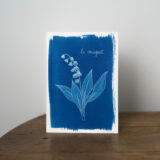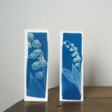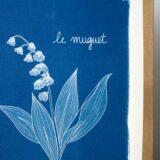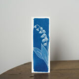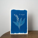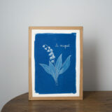 Tirage cyanotype d’une illustration de muguet, sur papier aquarelle 300g.