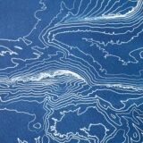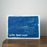 Tirage cyanotype d’une illustration réalisée à partir des relevés topographiques, sur papier aquarelle 300g. Il représente le Pic Saint-Loup, d’après ses courbes de niveaux.