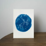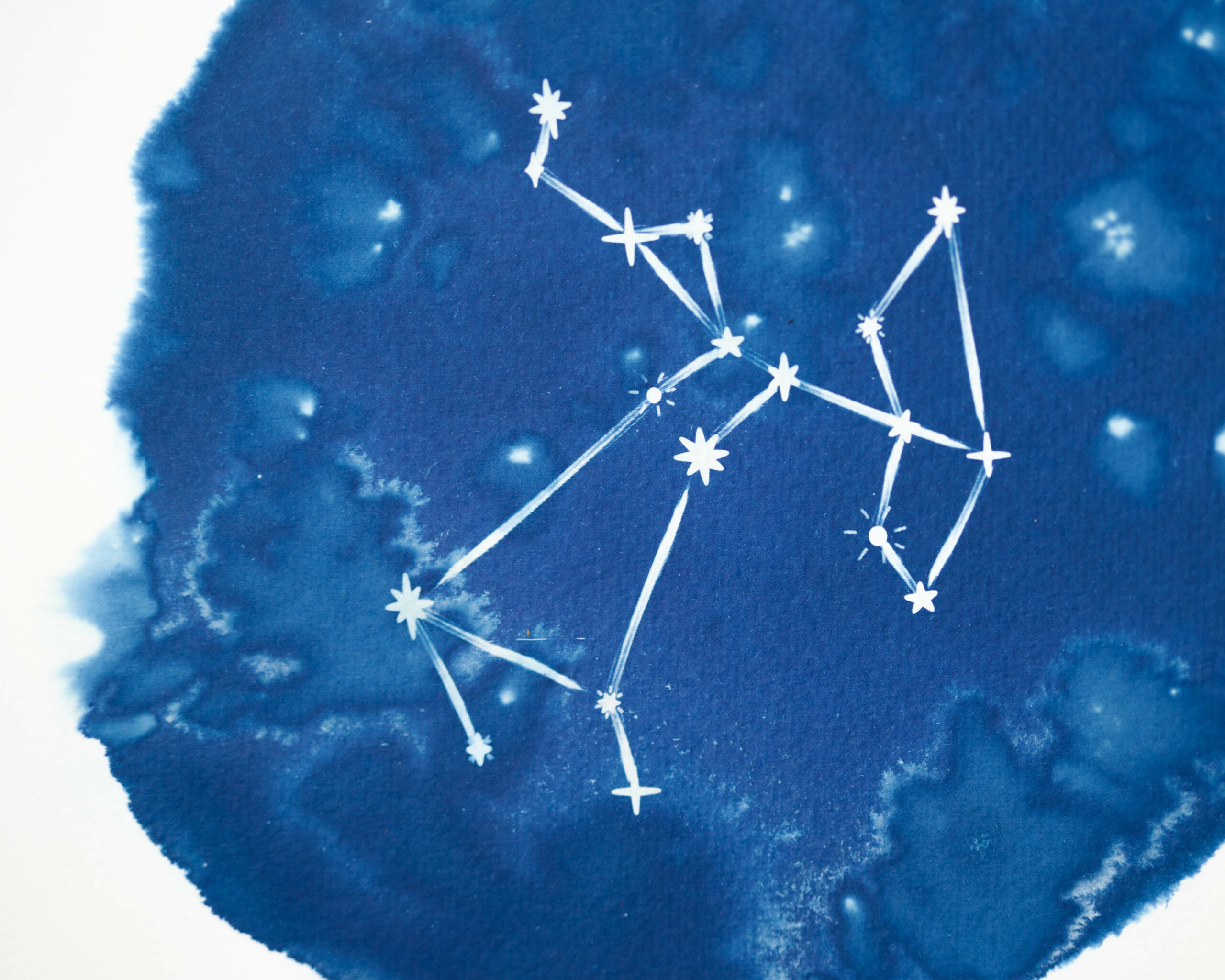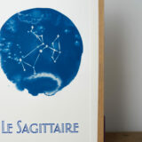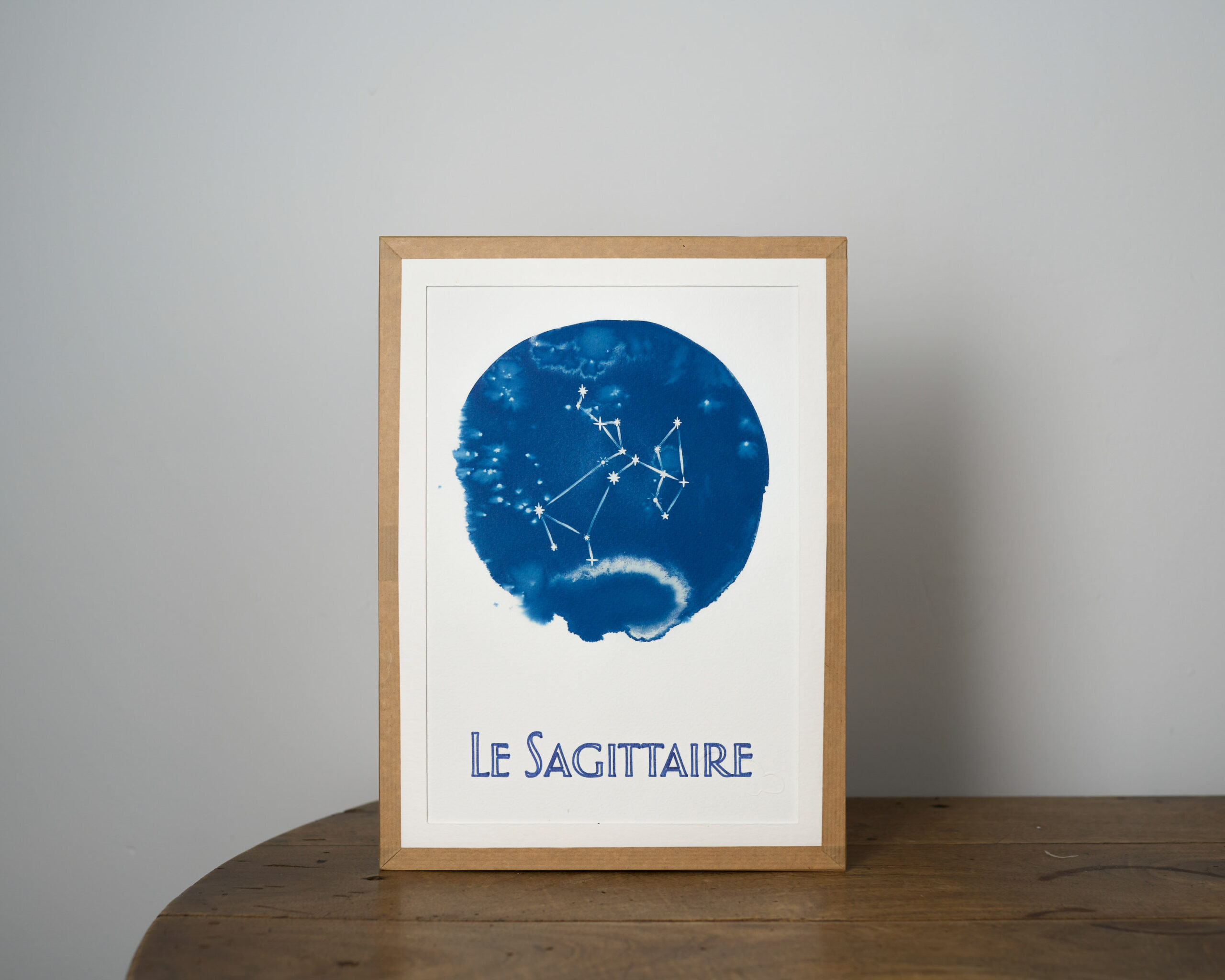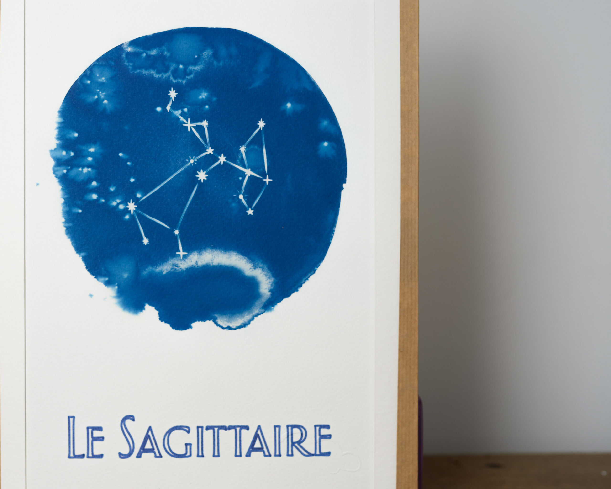 Tirage cyanotype d’une illustration de constellation, représentant la constellation du sagittaire, sur papier aquarelle 300g.