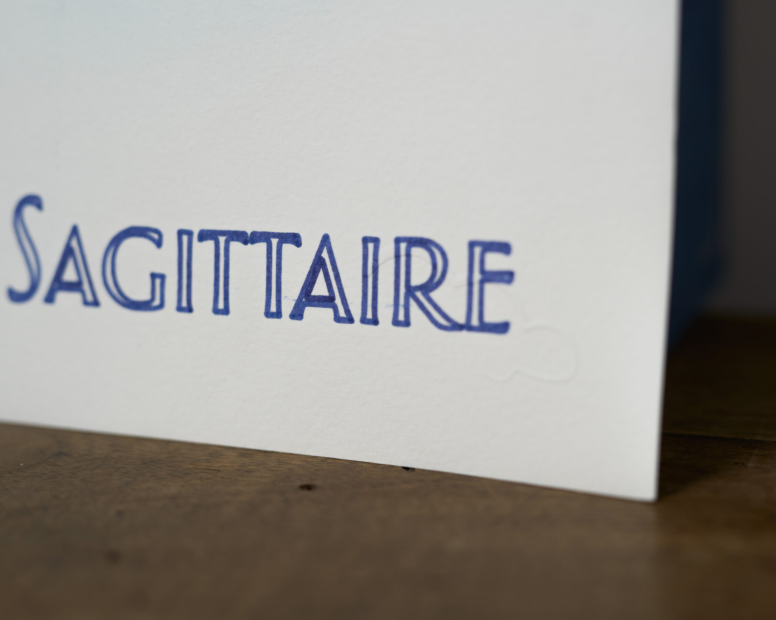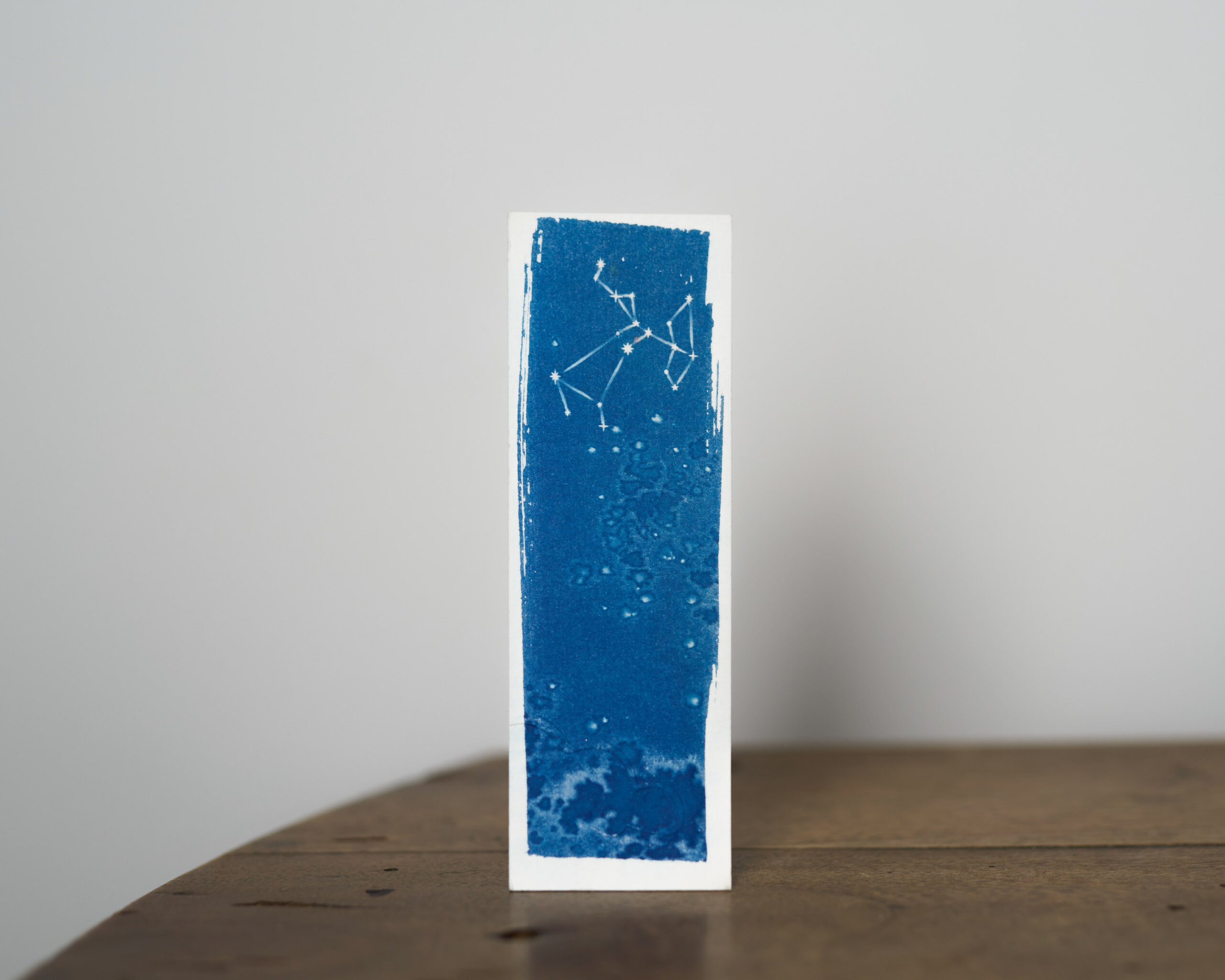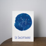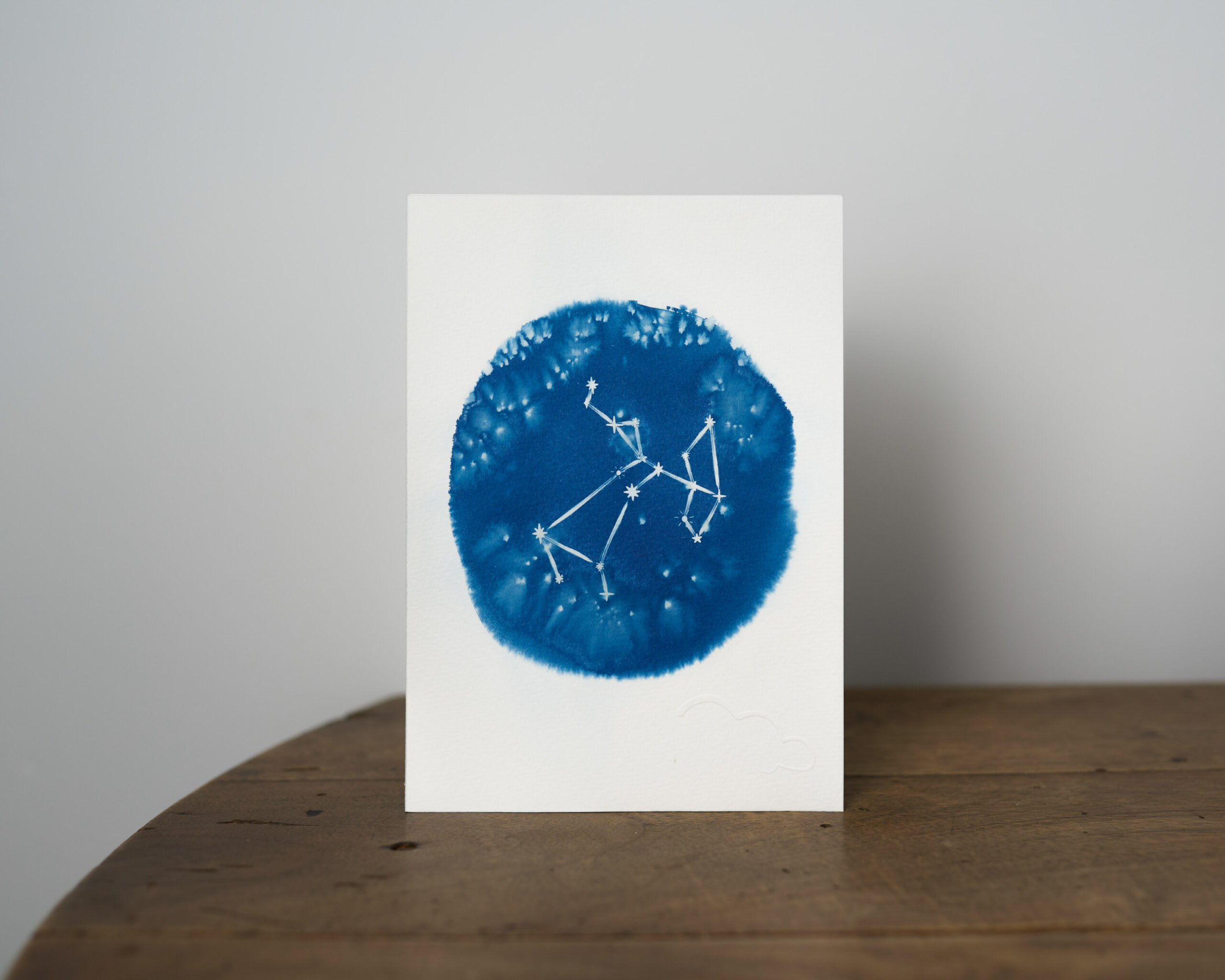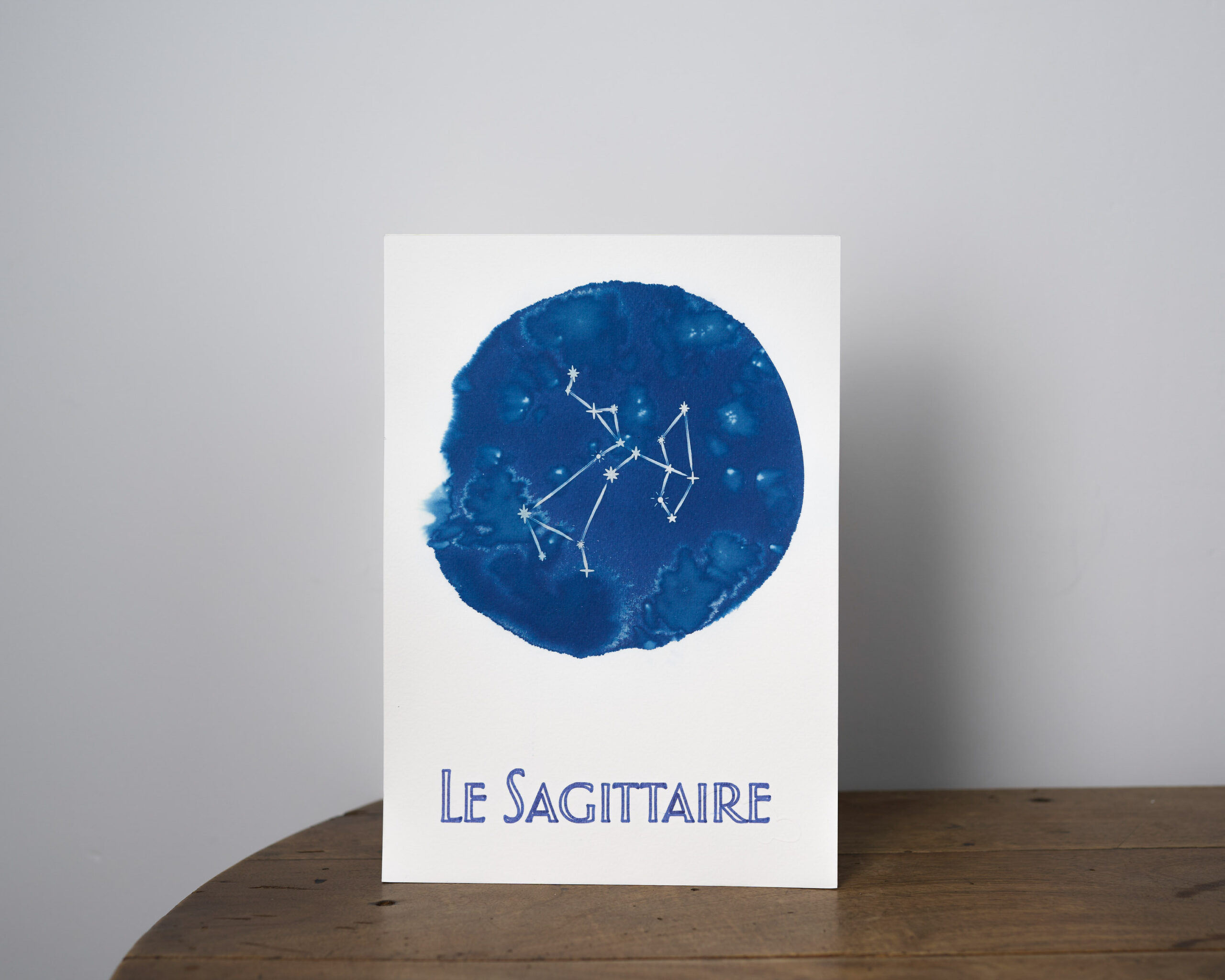 Tirage cyanotype d’une illustration de constellation, représentant la constellation du sagittaire, sur papier aquarelle 300g.
