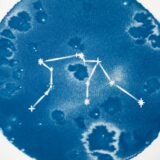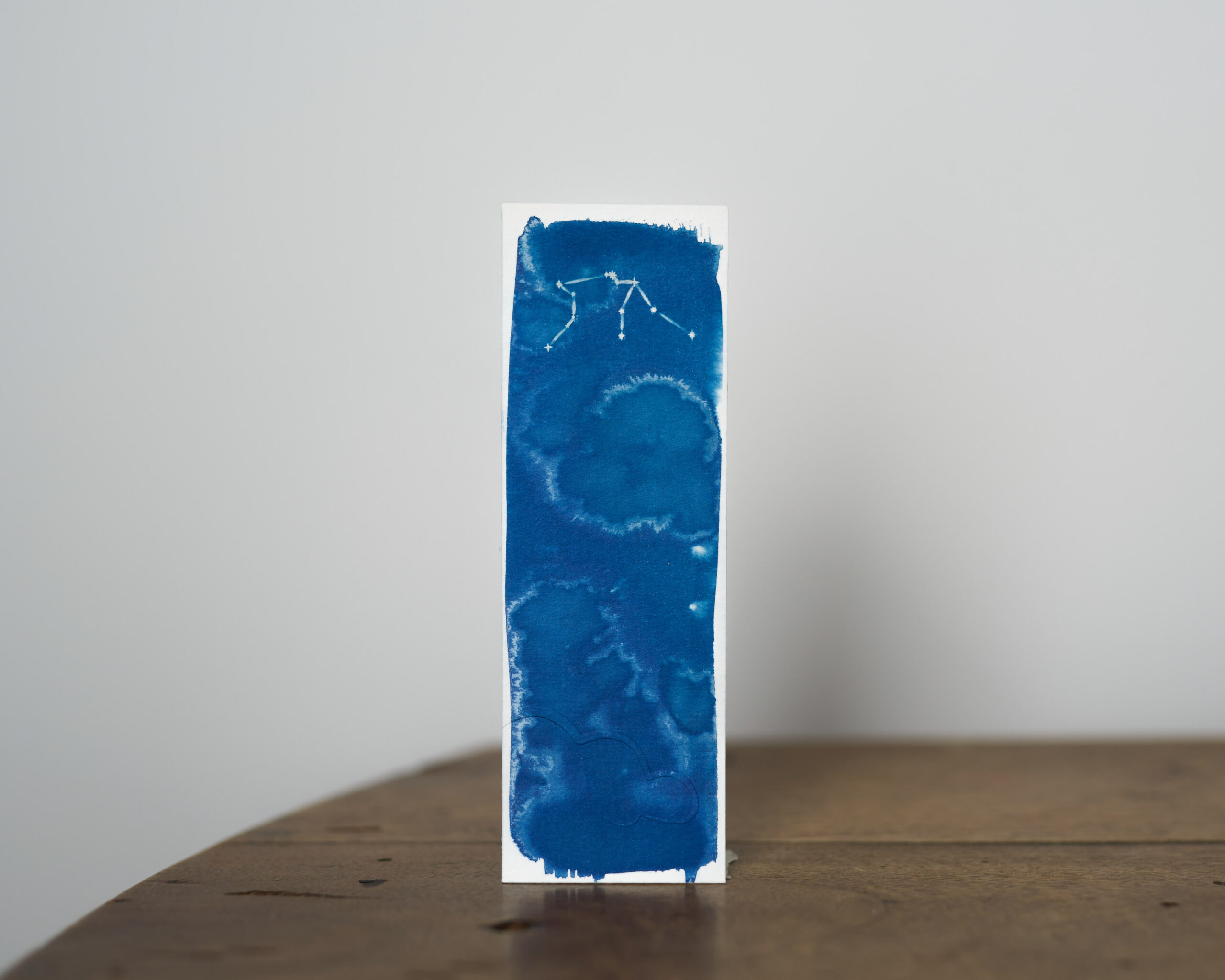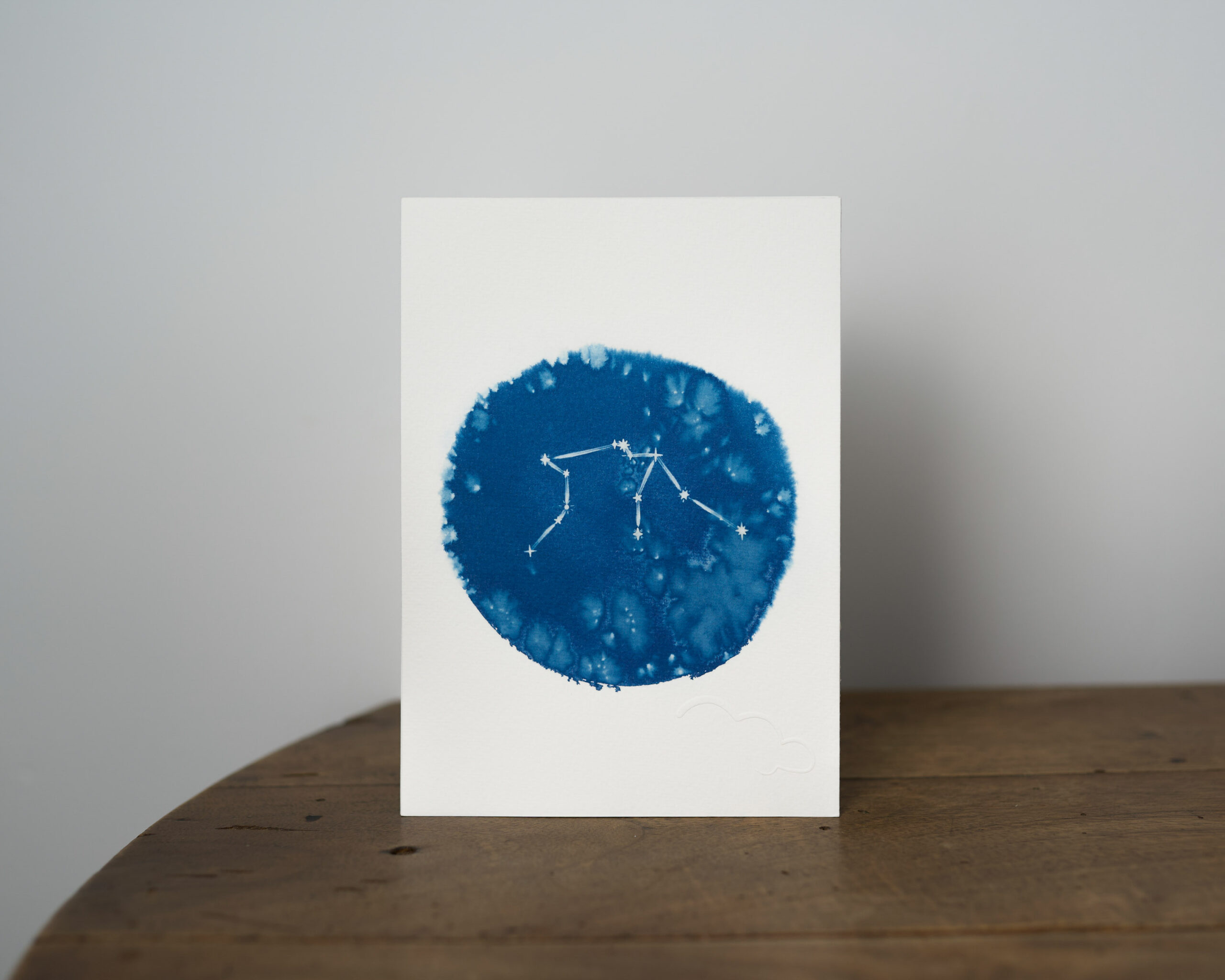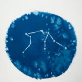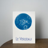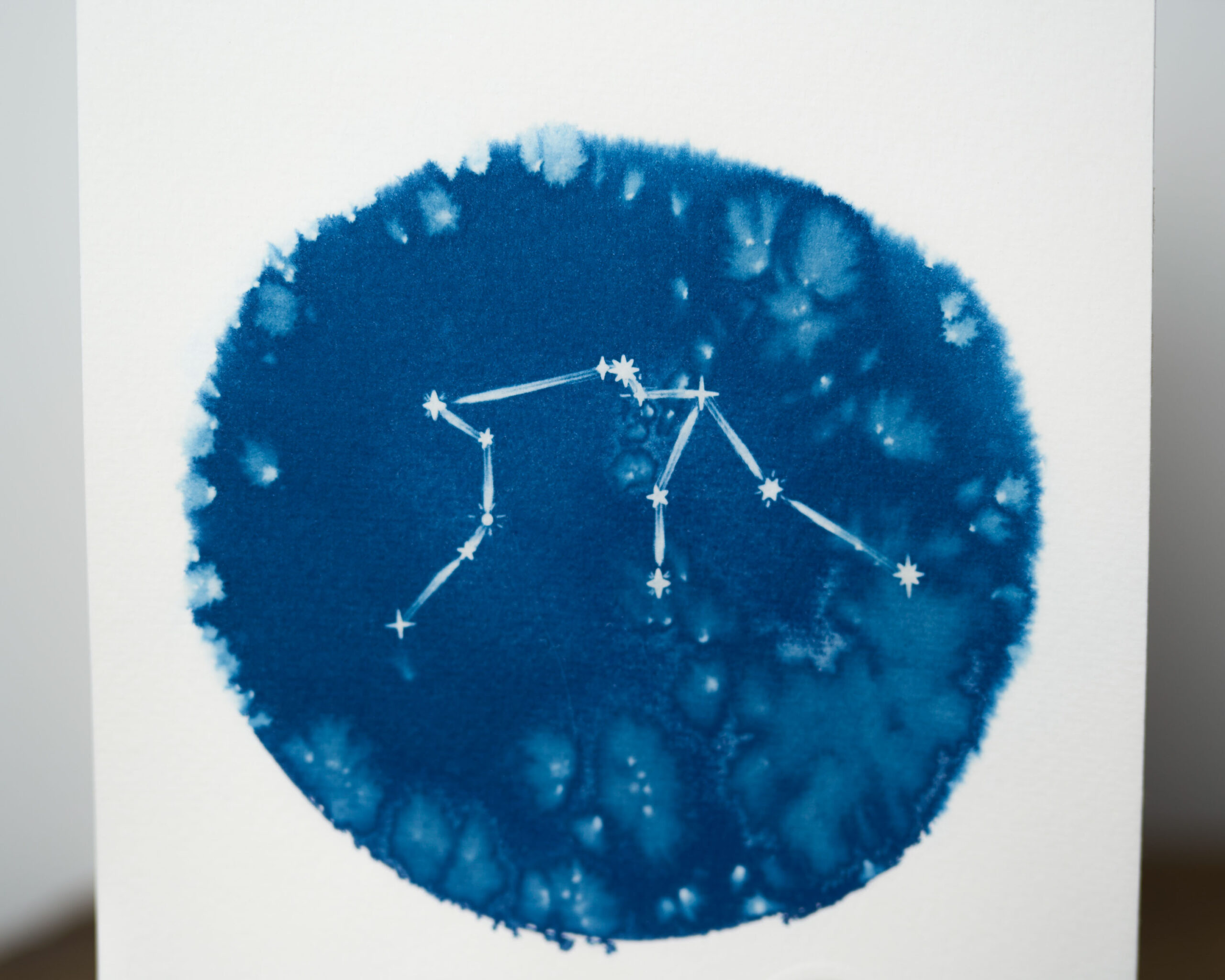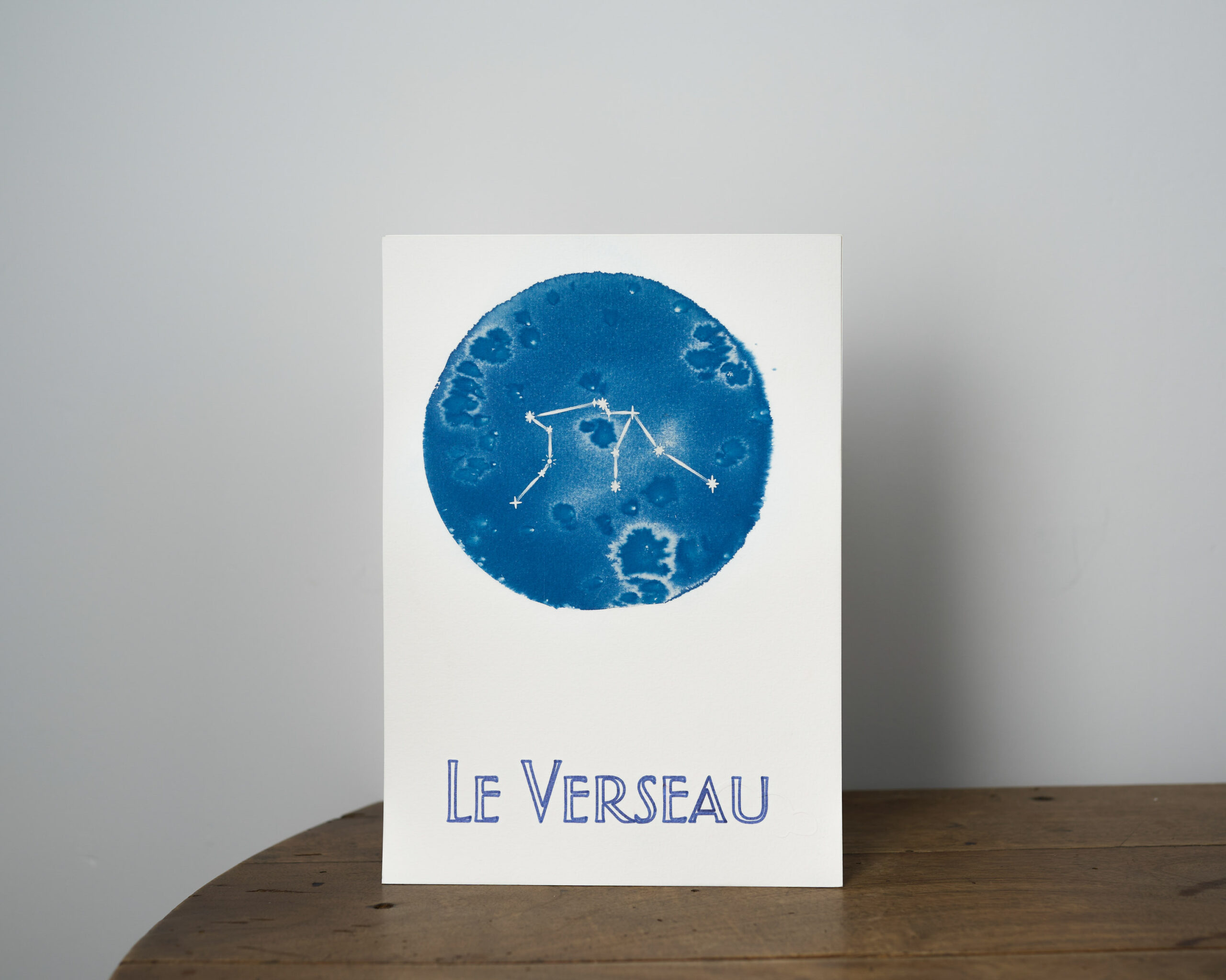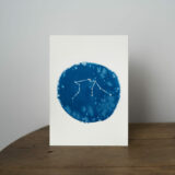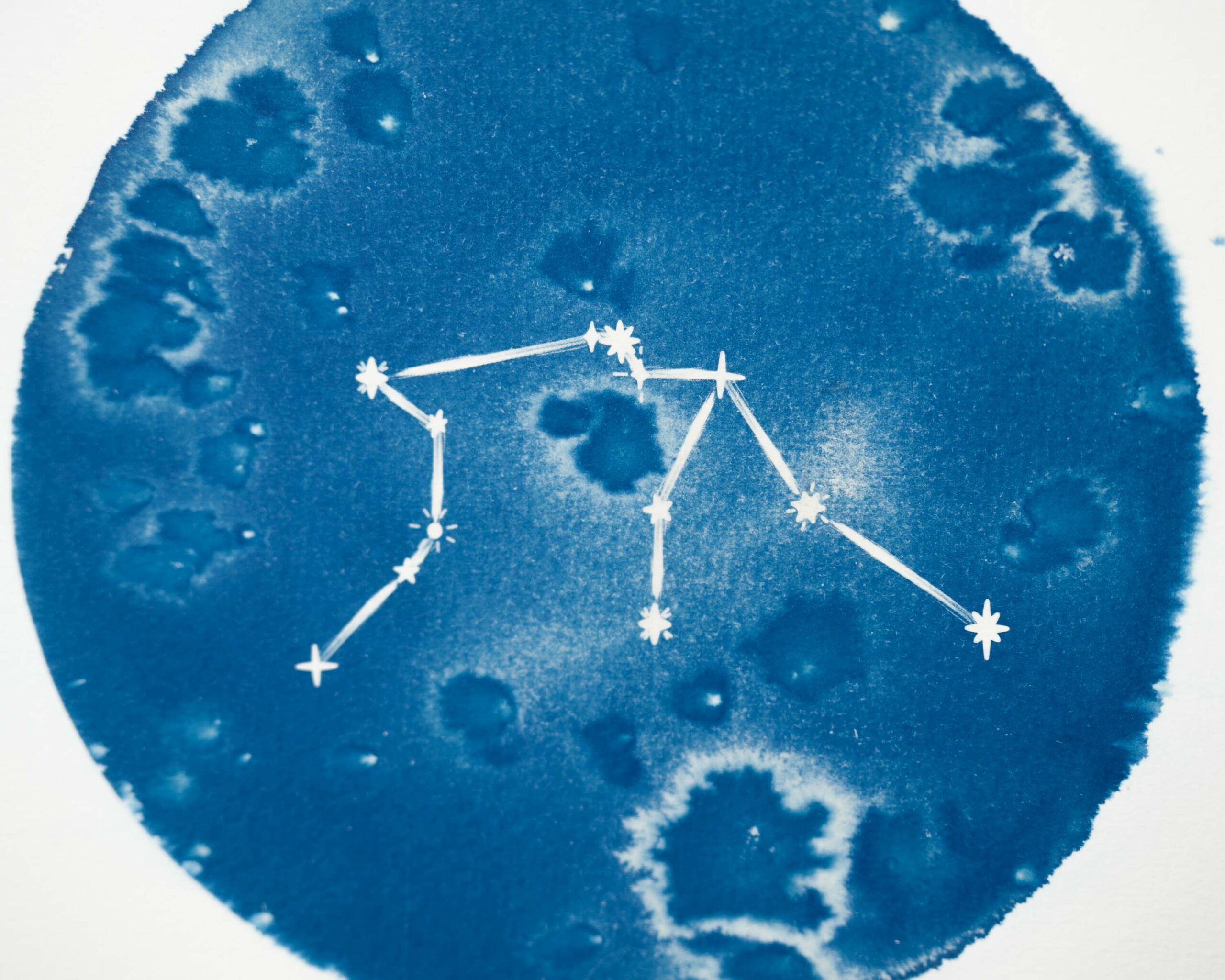 Tirage cyanotype d’une illustration de constellation, représentant la constellation du verseau, sur papier aquarelle 300g.