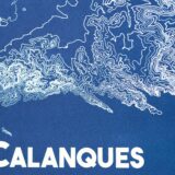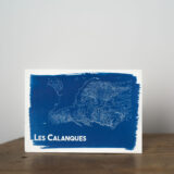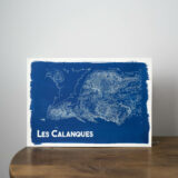 Tirage cyanotype d’une illustration réalisée à partir des relevés topographiques, sur papier aquarelle 300g.Il représente les calanques grâce à leurs courbes de niveaux.