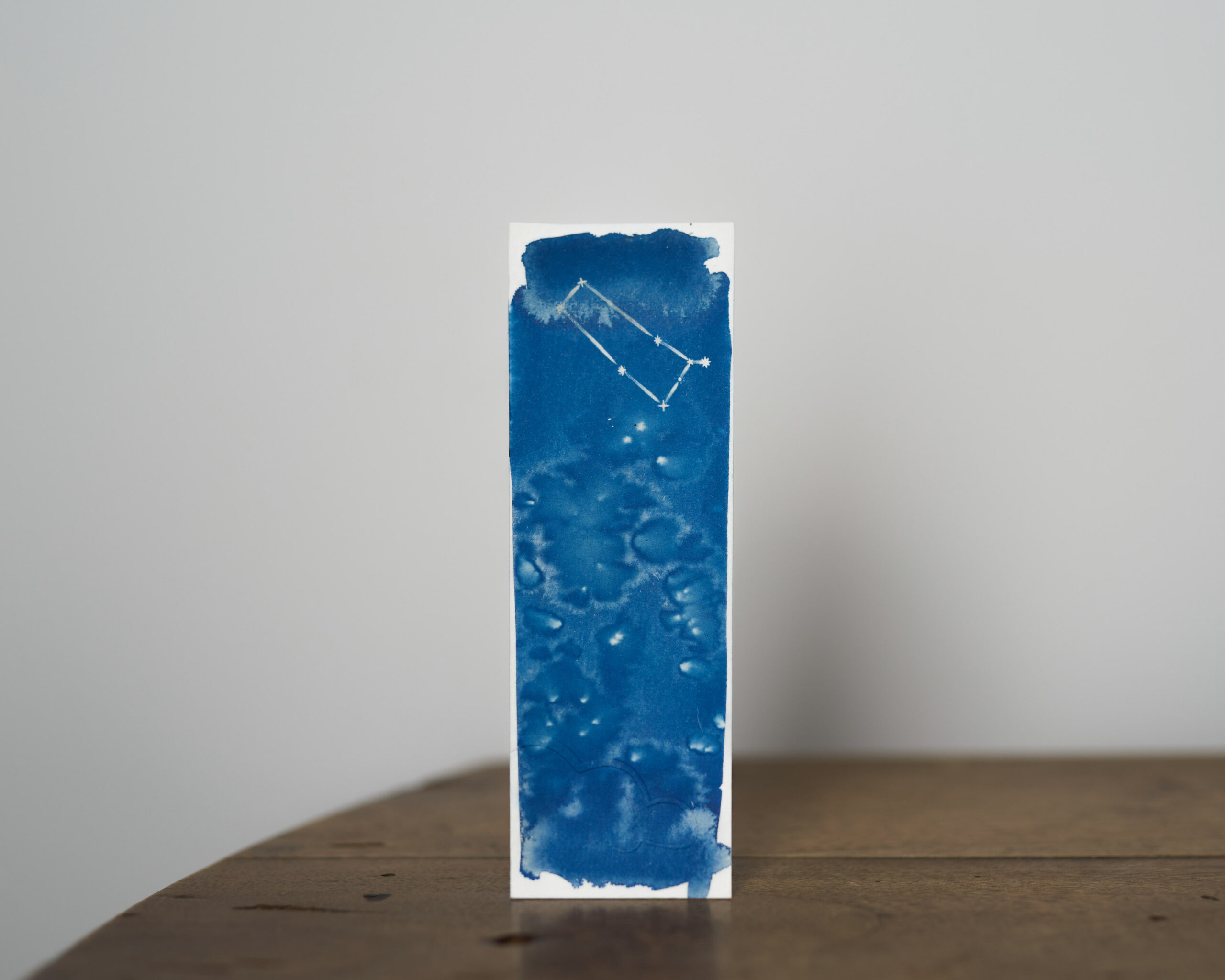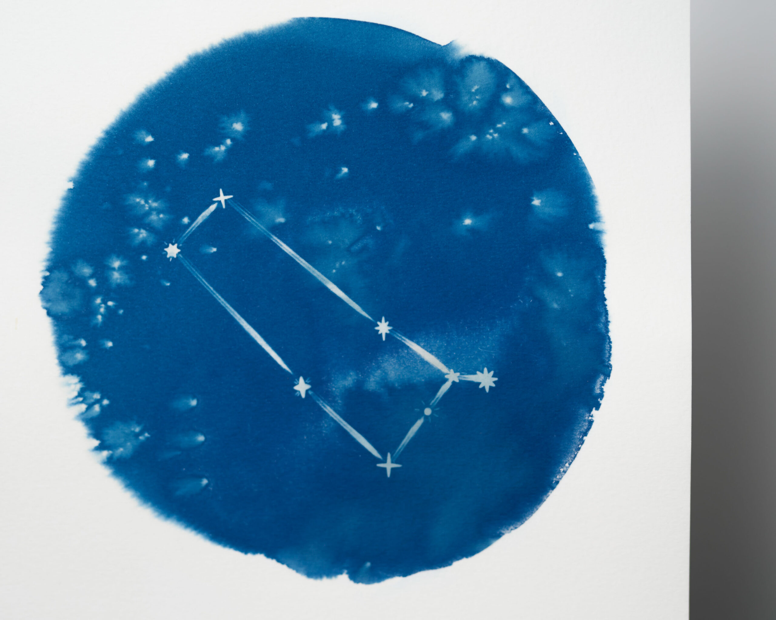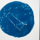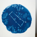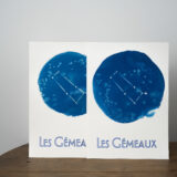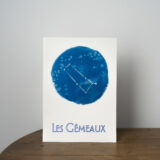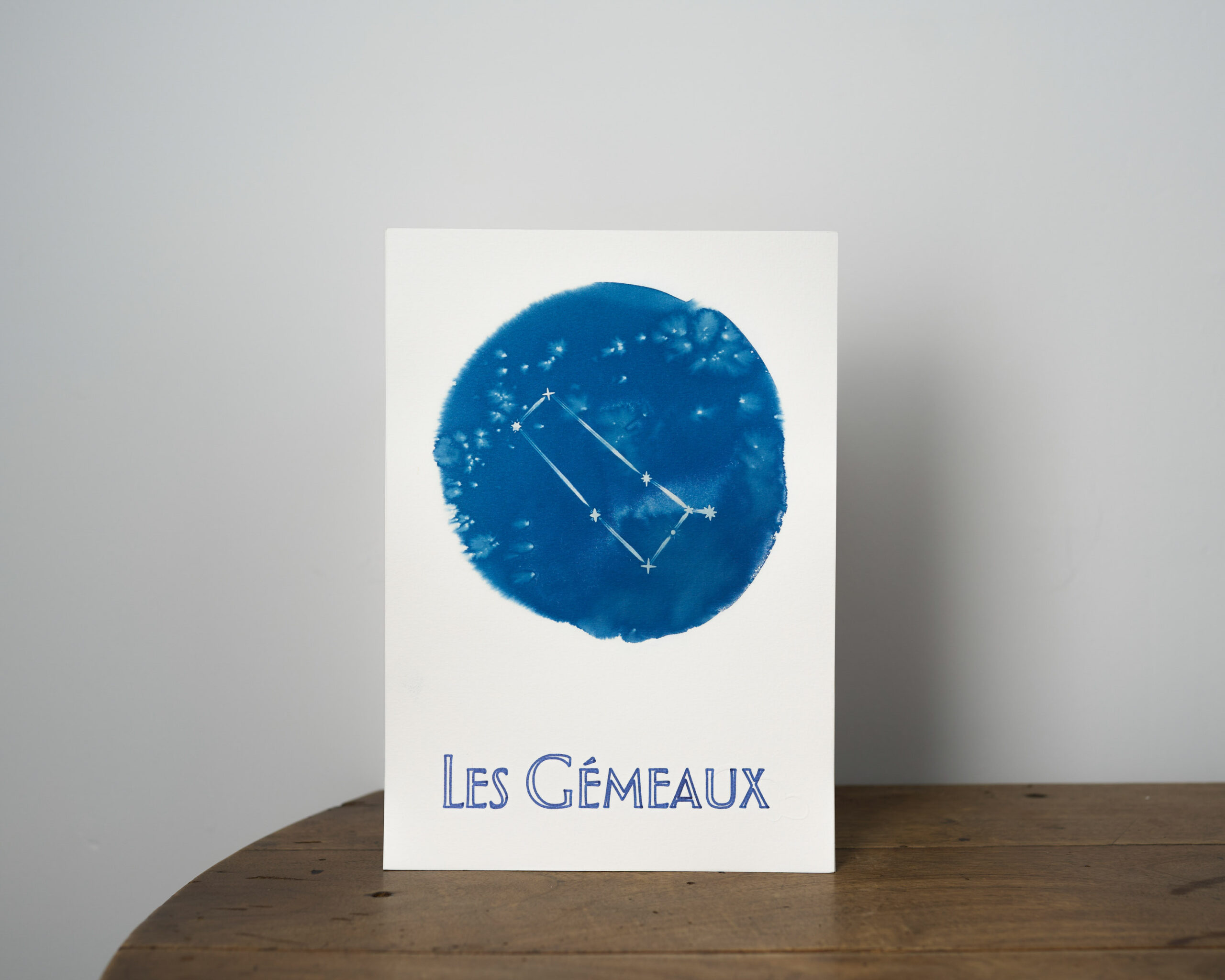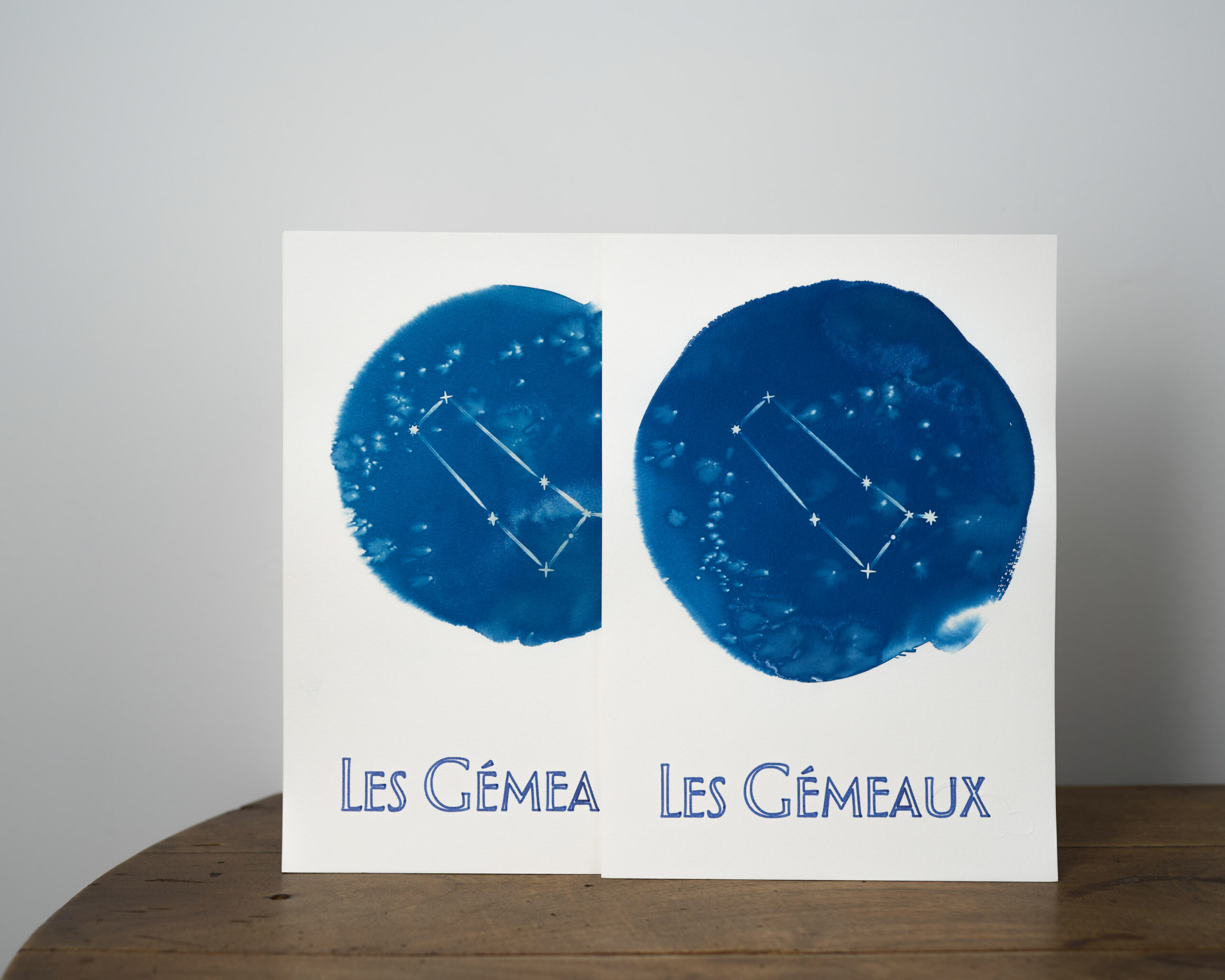 Tirage cyanotype d’une illustration de constellation, représentant la constellation des gémeaux, sur papier aquarelle 300g.